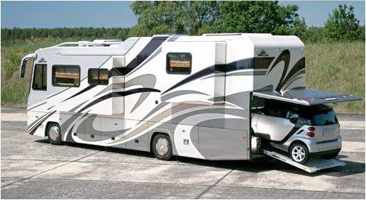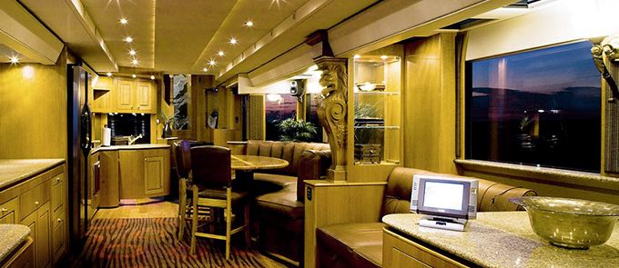房车家族中的庞然大物,形似豪华大巴,空间超大,内部设施舒适豪华(千万级别的至少得用奢侈来形容),家具家电已经俱全,多数具备拓展功能,甚至有的可以拓展成双层;部分车型还有小型车停车舱,可轻松容纳一辆跑车。通常价格高昂,几百万至几千万不等。