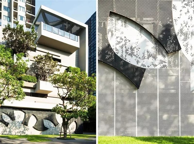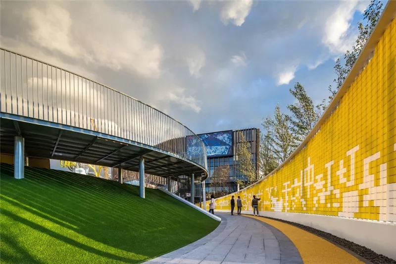 ▲花瓣的图案从墙面延伸至地面,草坪按照花瓣的形状生长,旁边的种植池也是花瓣的模样。