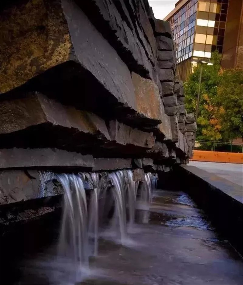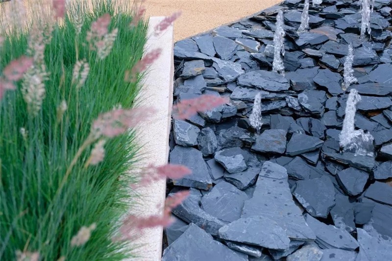 ▲深灰色板岩,米色混凝土,清新的小涌泉,摇曳的观赏草类