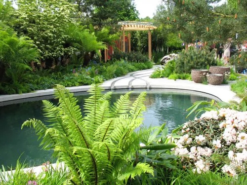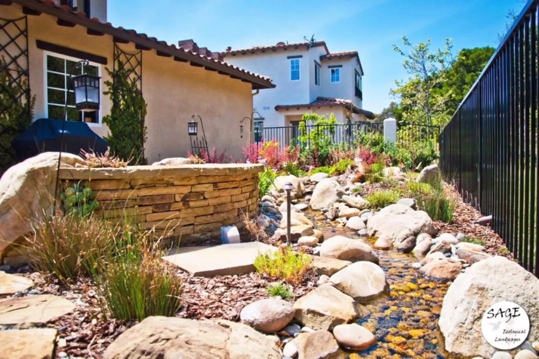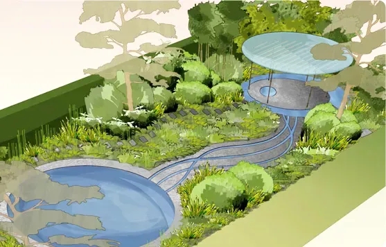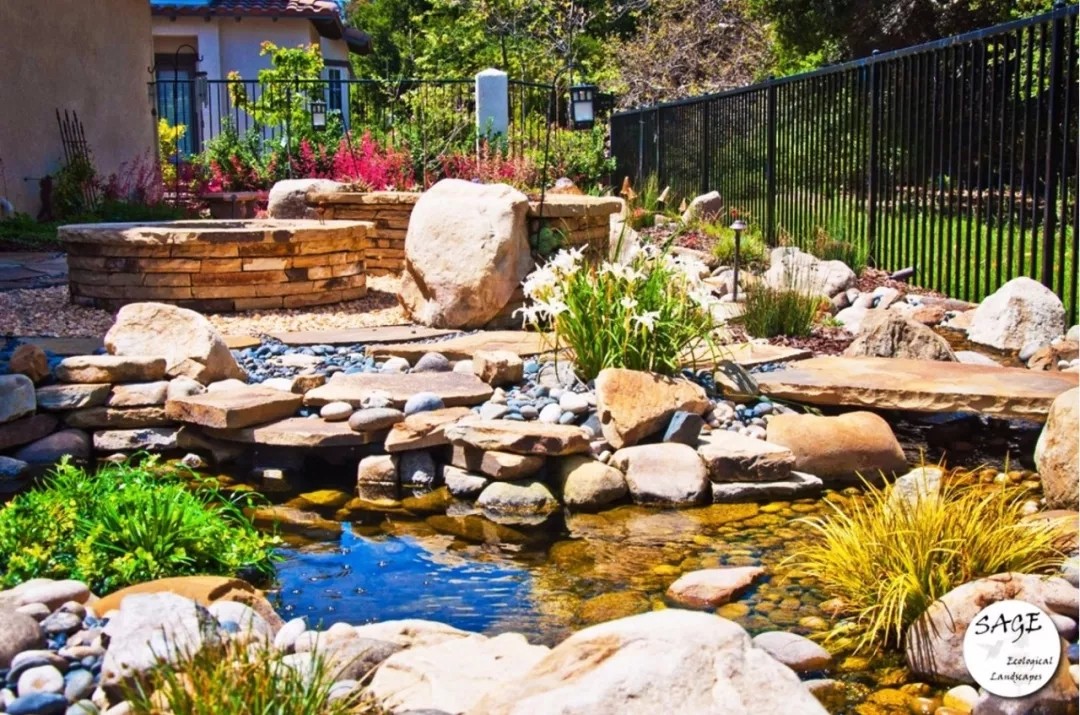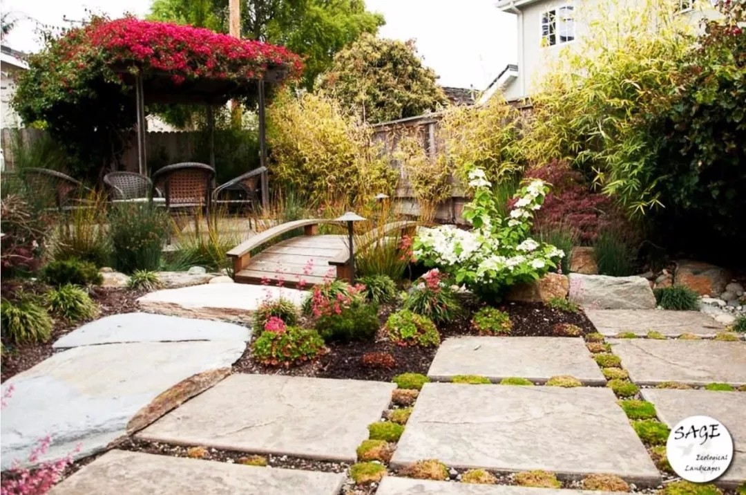 庭院中还有错落有致的绿色植物和多种不同色彩的鲜花植物,两个椭圆形的水池是由一条曲线形的镶嵌着溪水的小路来连接的,小路由花岗石铺砌而成。