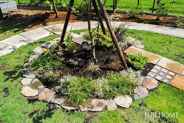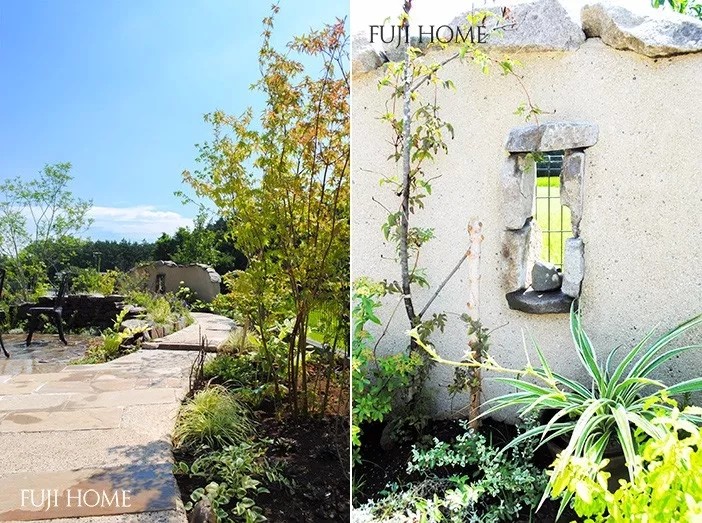 场地保留了原来花园的一些植物,边缘是天然的石头,外围种植的是草坪。