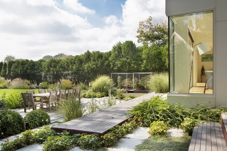 开放式花园享有周围绿地的景致。使用天然石材的梯田和砖石是亮点之一。