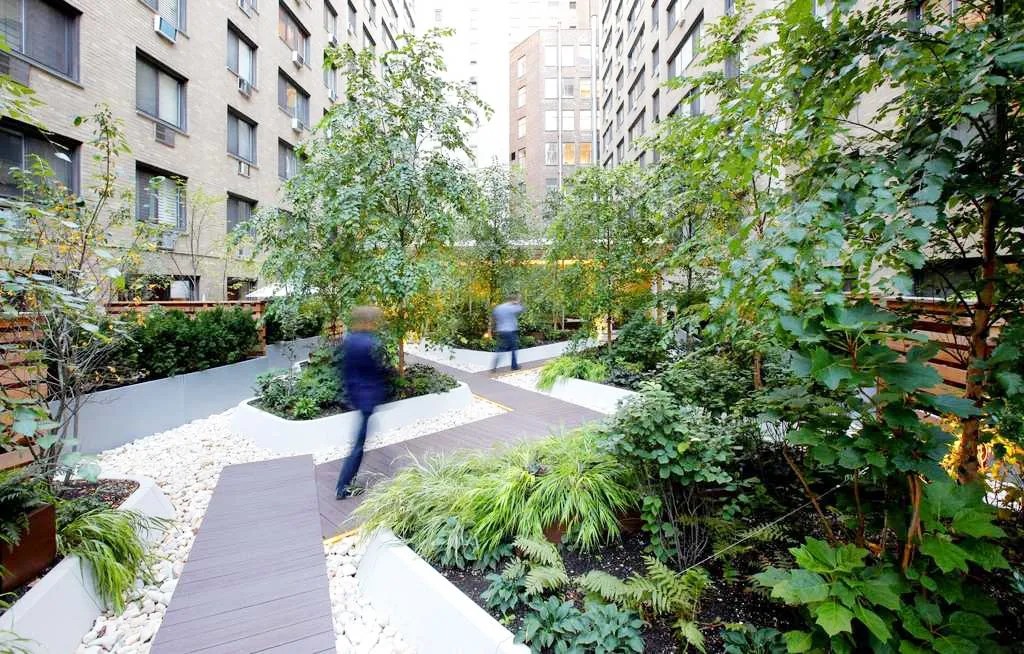 与流线垂直的多个行使空间具有横向扩展。它创造了一种柔和的表达,使植物和天然石材交织在一起