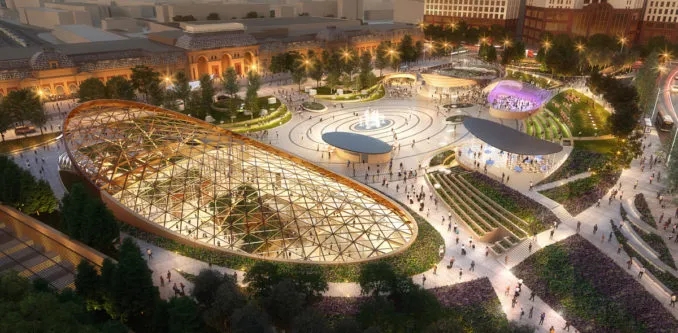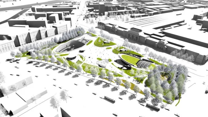 设计重新建立了历史车站和环路之间的联系,精心雕刻的公园坡度确保车站和零售入口之间的视觉平衡。