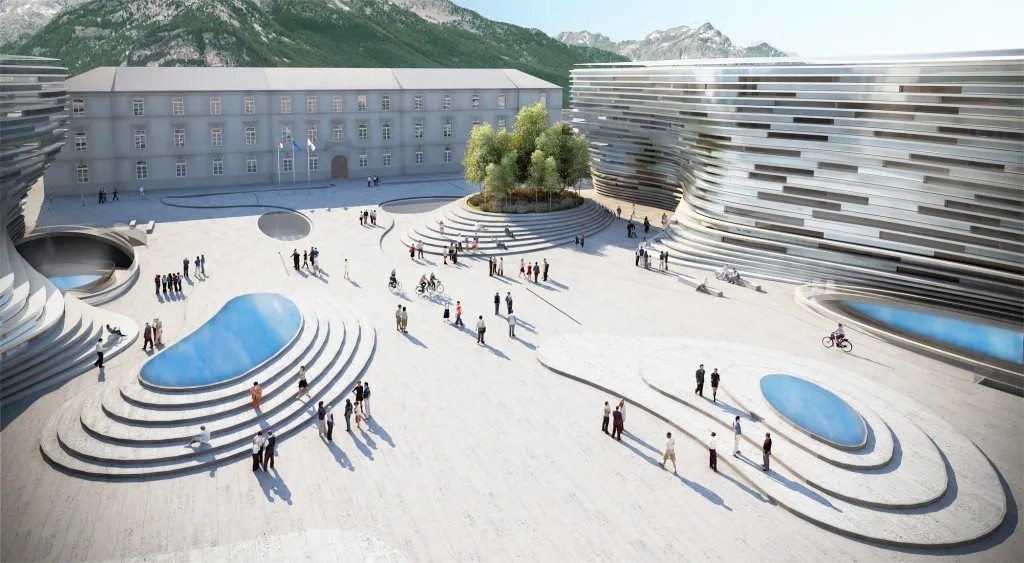 MC A从环境和人文可持续发展的角度出发,瓦莱达奥斯塔大学新校区的设计从层层叠叠的冰山形态中汲取灵感,融合自然生态景观,与当地白雪皑皑的高山相映衬,充分尊重当地自然环境和气候,彰显地域文化特色。