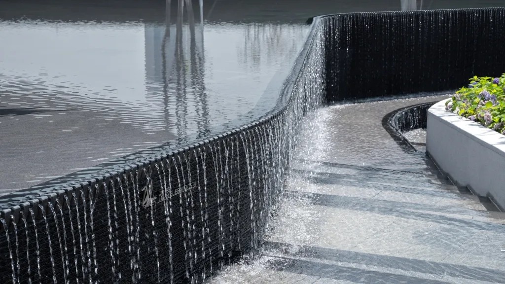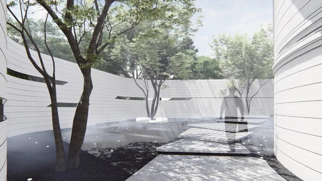 穿过主入口进入“瀑歌拾音”,是用层级跌水的形态作为转场后的首要展示界面,还是利用花池高差营造的瀑布水景来强化视觉体验?我们最终选择了后者。水的形态演绎在我们的空间里应是多样的,变化的。动静、高低之间的转换与过度才是整个空间丰富、多层次的演绎。