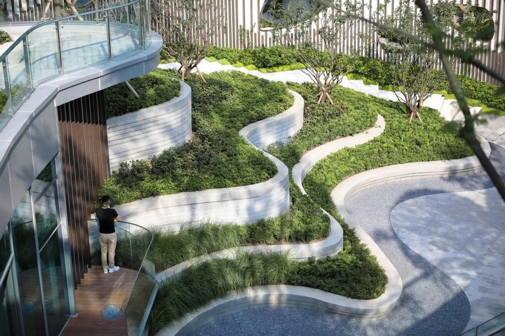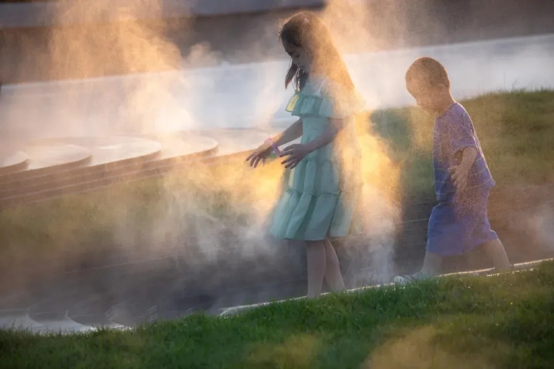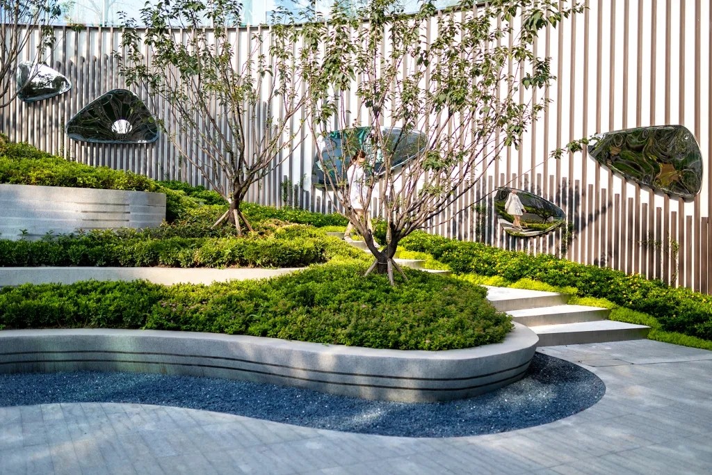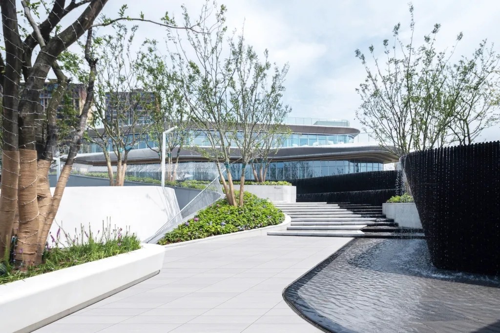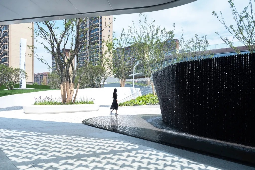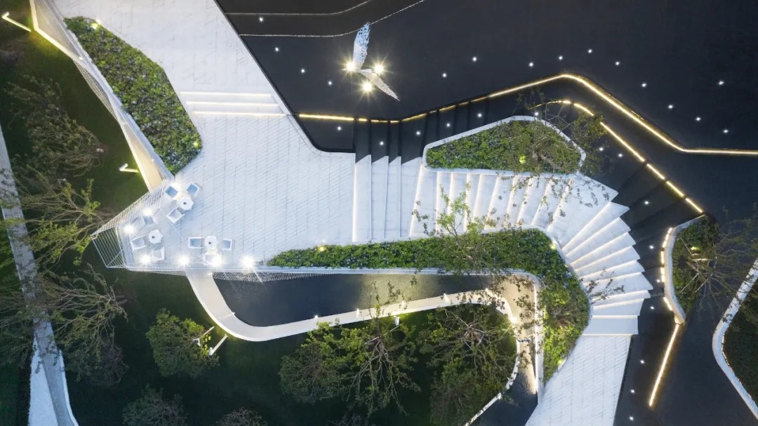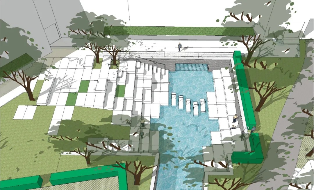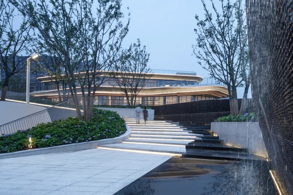 利用叠水、植物和参差的踏步的平台营造出高差错落的空间感受,形成更丰富的景观空间体验,也让空间在此发酵出更多的可能性。从踏步与水景台阶齐平,到水景与台阶的错落咬合,我们模仿森林的潺潺水溪与茂盛绿岛,在看似限制条件、却也是天然优势的高差中,打造出都市少见的山地景观体验,向自然致敬。