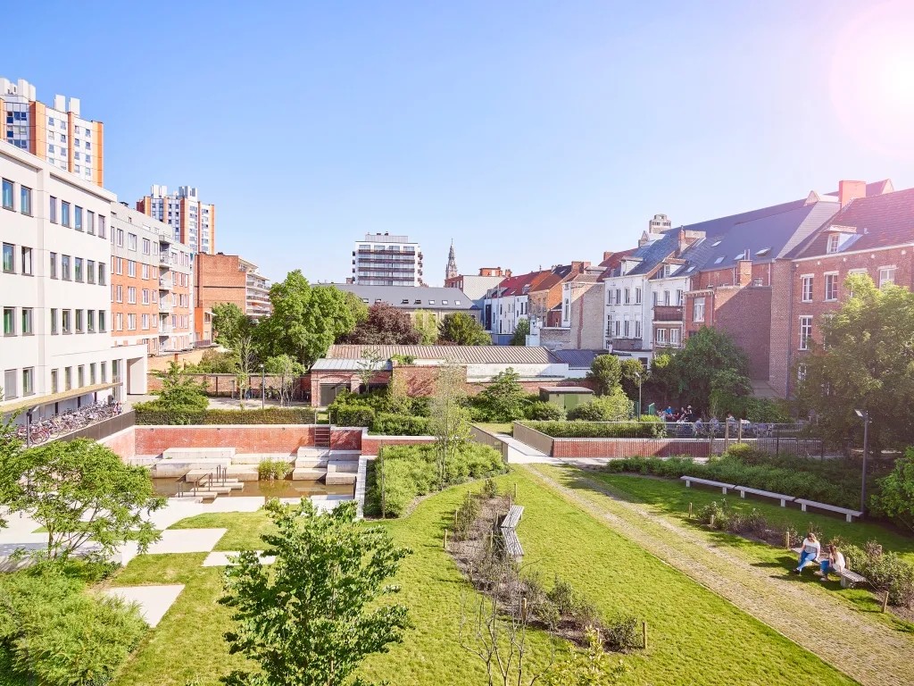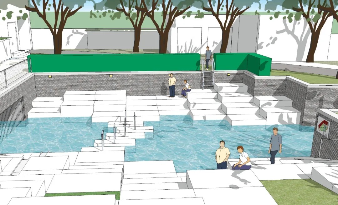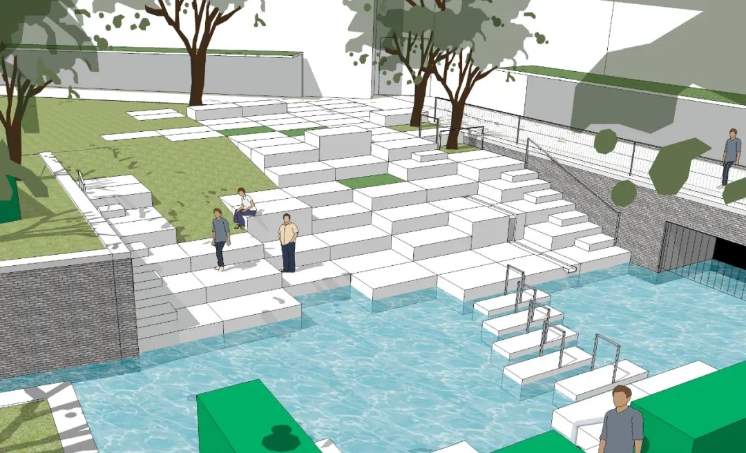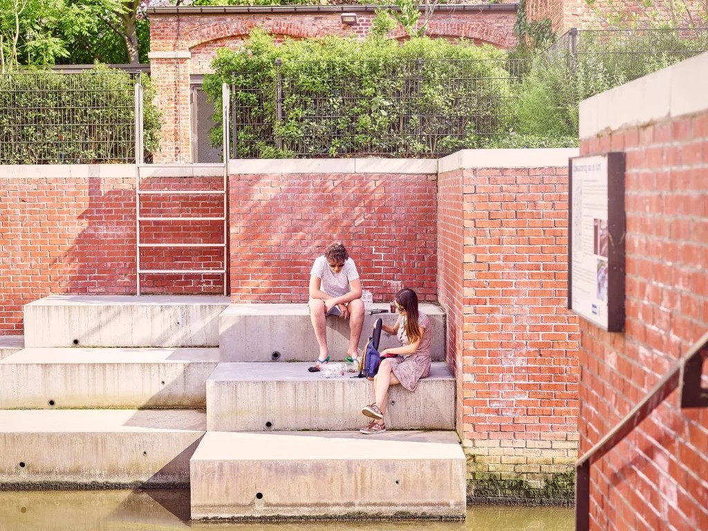 将整个河床打开后用红砖砌墙加固。在这整个花园中,能看到“曲折有致”的码头墙,以及由预制混凝板做成的错层下降的平台形成的河床空间。平台与平台间会形成一个凹空间,吸引了一众学生来这放松、晒阳光浴。