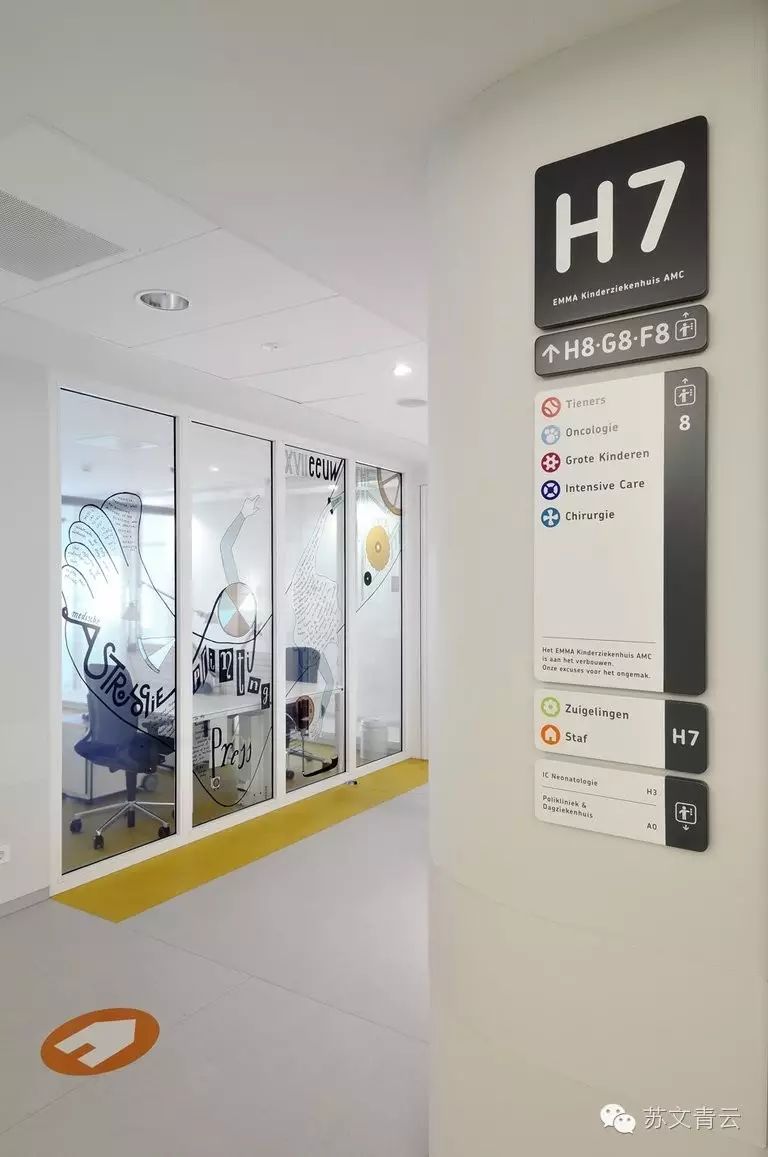 这个项目包括了医院的墙壁设计和连结各个区域的导视系统,而一个主要的连廊成为设计的重要组成,通往广场、动物园、公园、体育设施等,最终到达婴儿的卧室。道路作为公共场所,连接着婴儿、家属和医院的各个部门。每个重要的公共场所采用一种代表性的颜色和图标,作为重要的导视依据,出现在各个婴儿房、公共区域等地方。