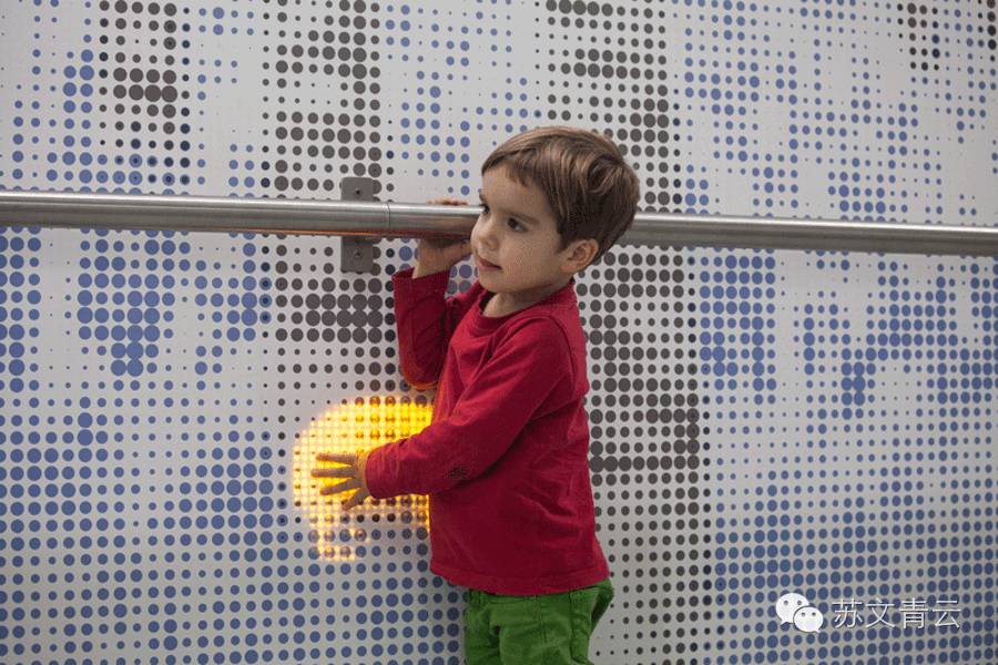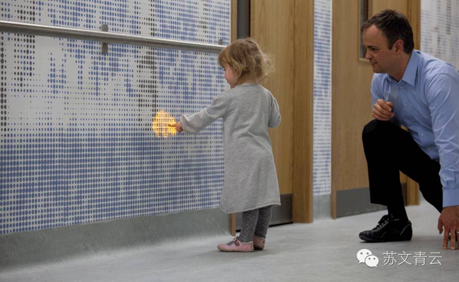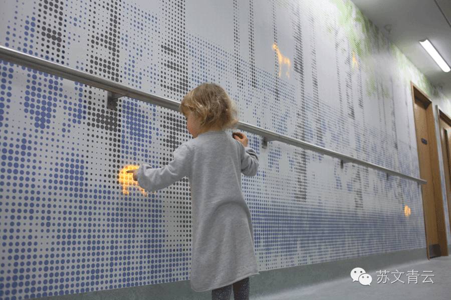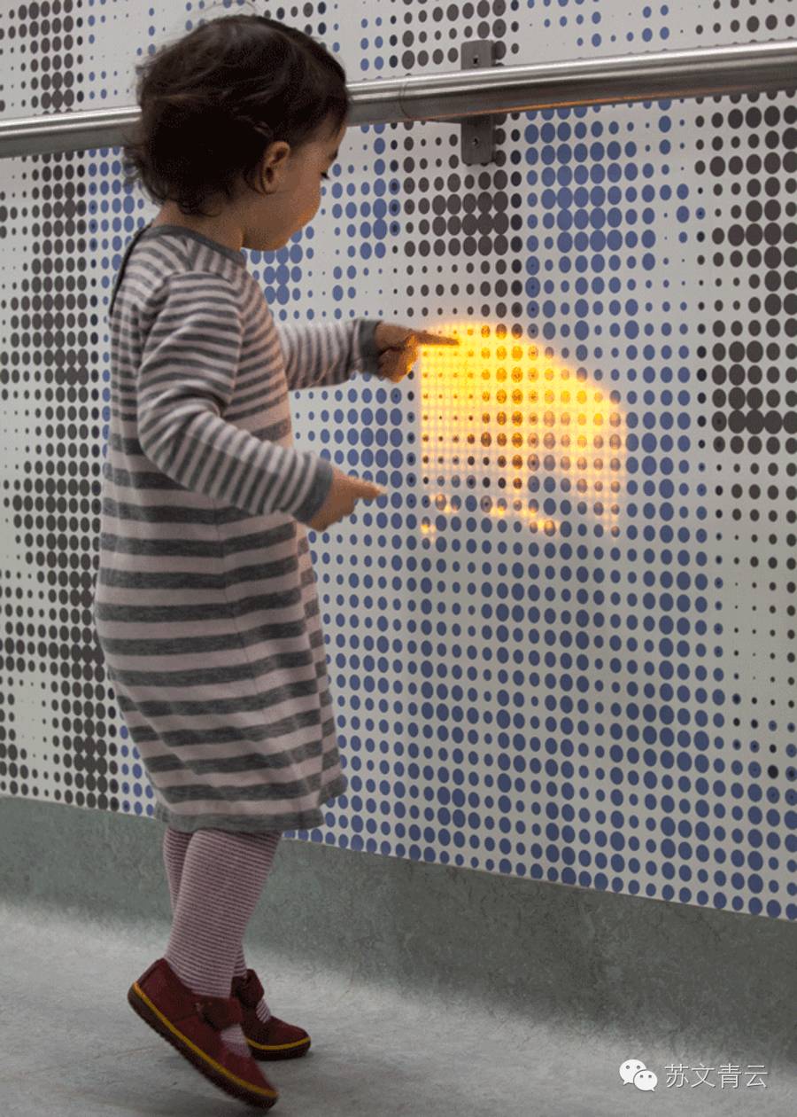 在伦敦大奥蒙德街儿童医院的米塔尔儿童医疗中心走廊上就安装了这样一面165英尺的墙壁。当里面的传感器感受到有人“触摸”到自己,便会以交互式的动画模式出现有如马、鹿、刺猬、鸟类、青蛙等光形。