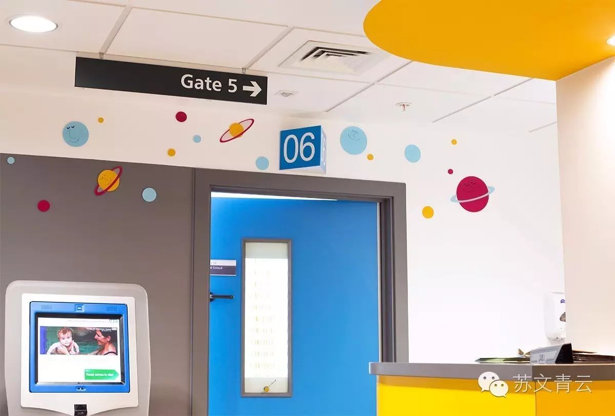 由美国HKS 建筑公司设计并参与建设的澳大利亚墨尔本皇家儿童医院(RCH)是维多利亚州政府合作项目下的公私合营项目,2011 年投入使用。其建筑外观设计、内部装饰和导视系统设计堪称同行业的杰作。它以儿童的活动和视觉感官体验为中心,同时立足医院的服务范围和服务特点,整体带给孩子们轻松愉快的就医体验和强烈的视觉感染力。医院室内设计采用以家庭为中心的看护,85%的病房都是单床房,为患儿和家属提供了私密性。房间给人的感觉就像在家一样,并安装了一流的娱乐系统、灯光控制和放置个人物品的地方。新医院还配备了超市和一个运动馆,给就医的孩子提供了最好的康复环境。医院内部的装饰充满了童趣的设计,墙壁上绘有涂鸦风格的图画,五彩斑斓的色彩布局统一,繁而不乱。每个区域的主体色调都有所不同,代表了不同区域的分类。导视系统的设计,与墙壁的绘画和色彩的分布相互映衬,导视看板的设计简洁、明朗、醒目、活泼,符合儿童视知觉的情感需要。