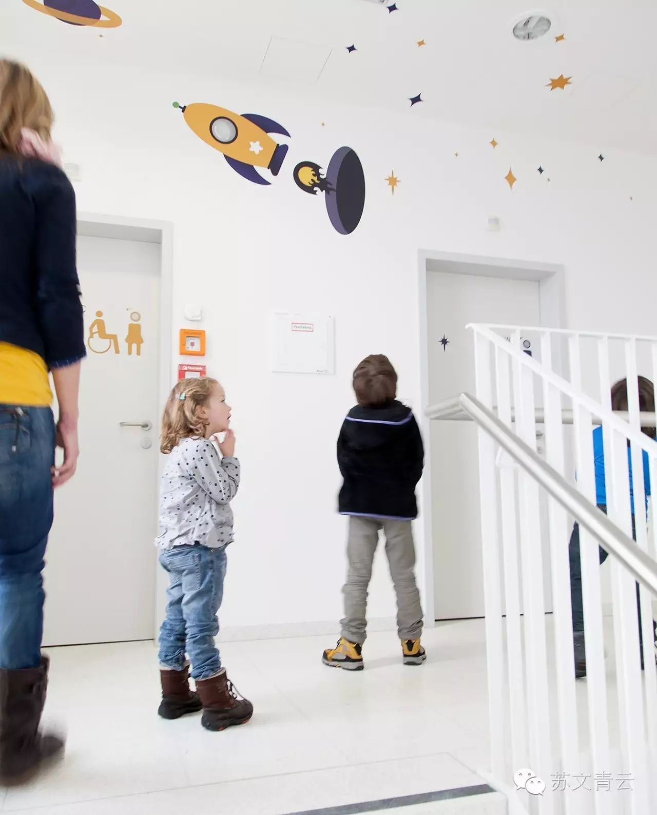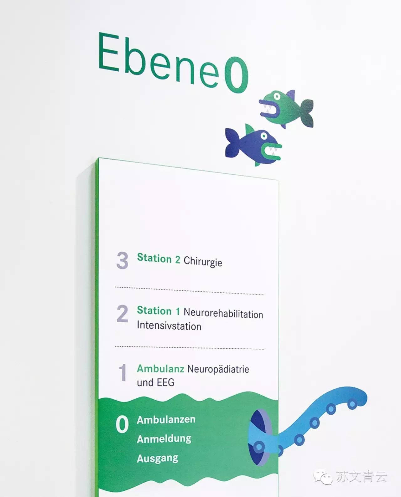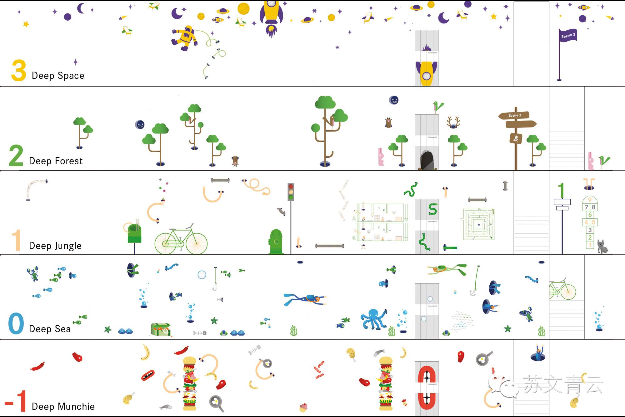 萨尔茨堡LKH儿童医院环境系统设计,buero bauer团队通过为医院每个楼层提炼一个主题进行了设计,小鬼穆奇、深海、丛林、深森再到天空,由地下到天空,元素设计得非常可爱、幽默童趣,整个创意玩转了医院的每个角落。