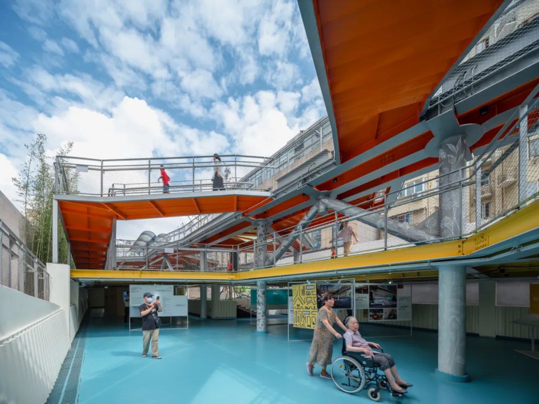 首层向上抬高 1.4 米,预留出部分底层空间作为社区“收纳器”提供如艺术展览、社区活动、文创集市等临时性功能;
