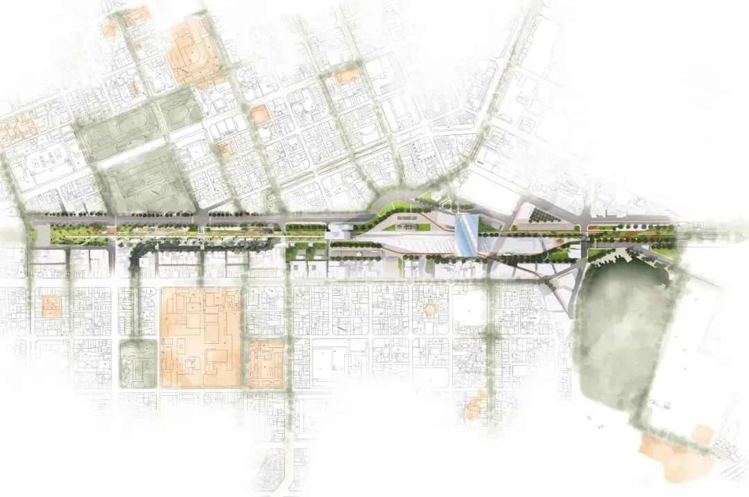 全区配置图驳坎两侧斜坡上原有的铁路基础设施:保留现有的斜坡,并建立一条连接驳坎上下的公共路径