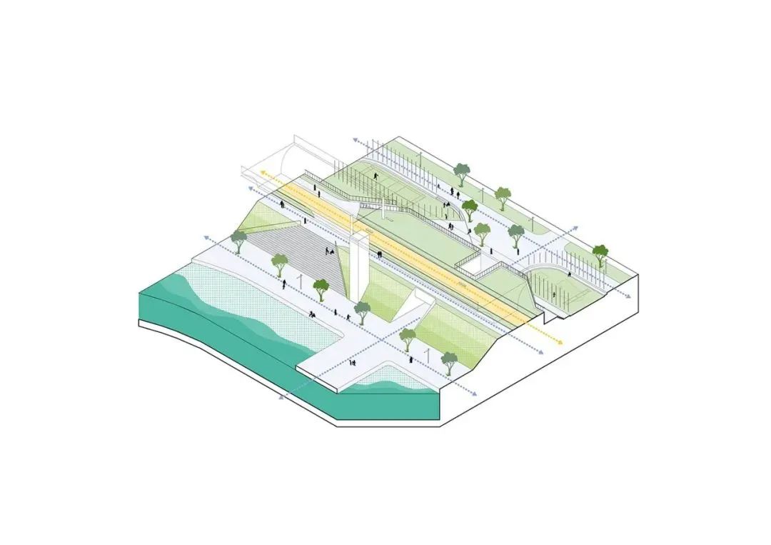 虽然该条铁路线曾经将人们联系在一起,但其废弃的状态更像是一道阻隔的屏障,由于它紧靠绿川且位于驳坎之上,并不利于轨道两侧的流通,重新对驳坎进行利用,以永续发展的方式连接城市的不同部分,为生物多样性创造绿色走廊。同时建立自行车道和人行道,以更好地满足沿线社区的需求。