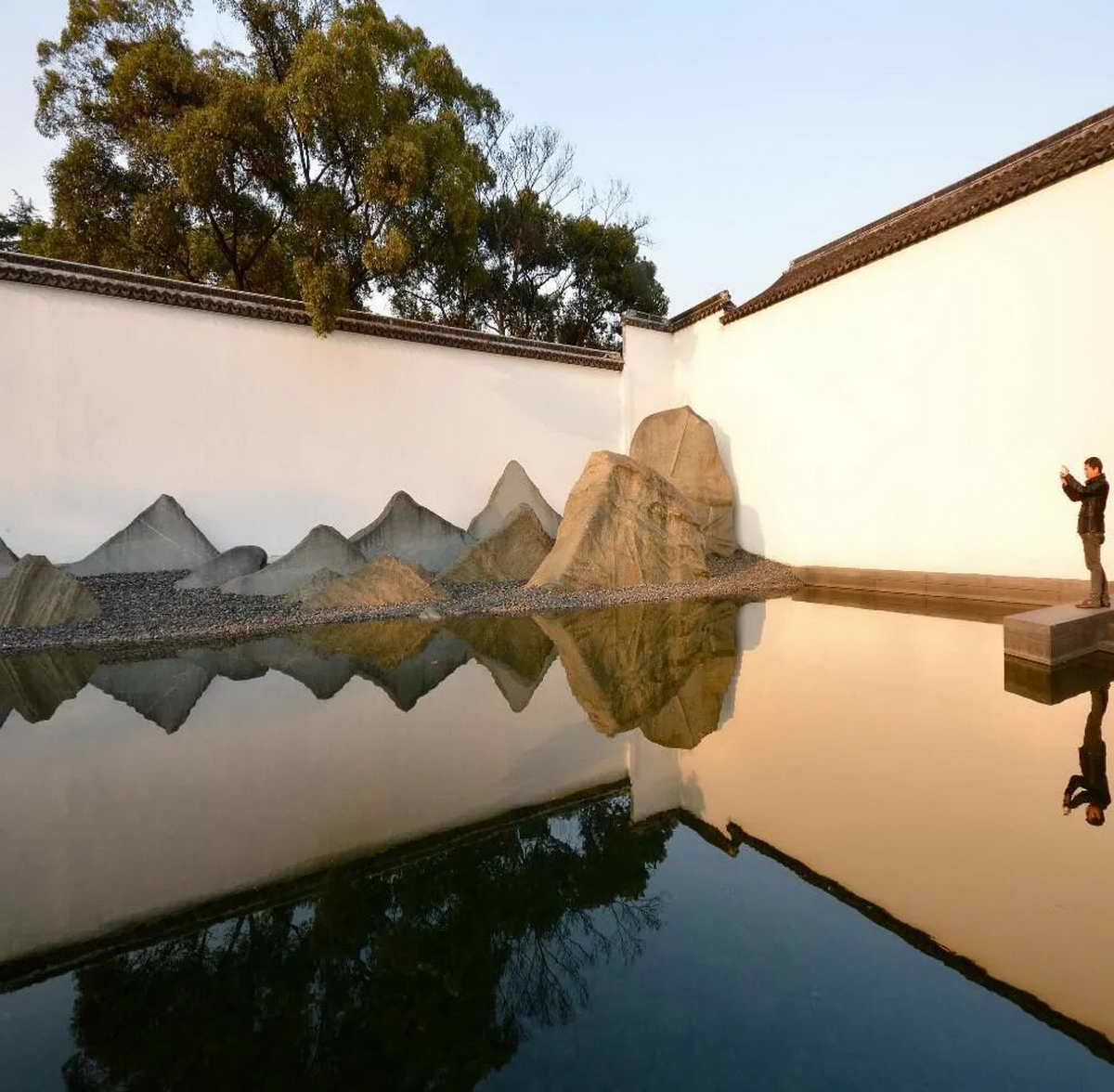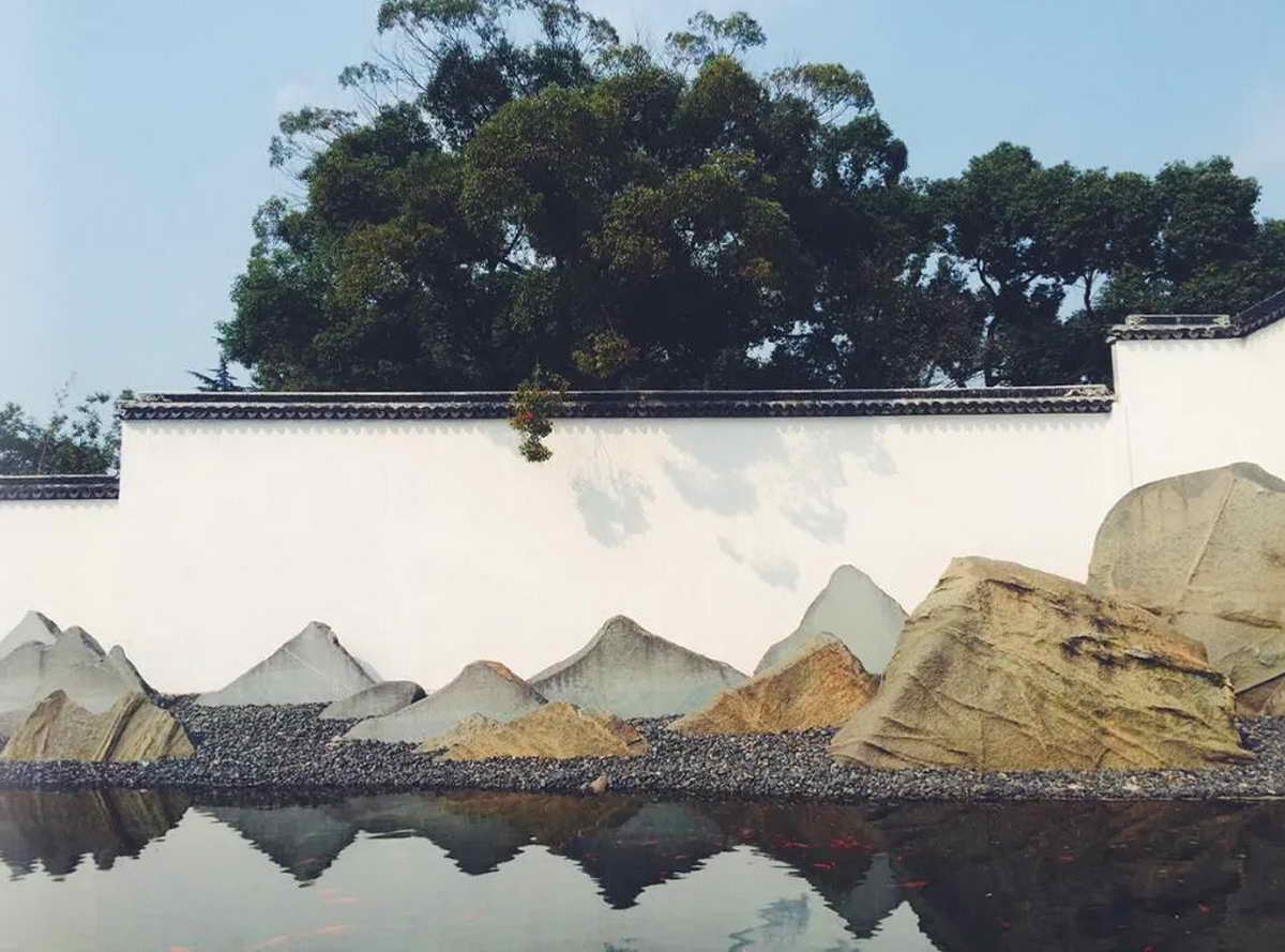 北墙之下为独具创意的片石假山,贝先生一直对扬州八怪中石涛的“片石山房”情有独钟,并有意在苏州博物馆中“以壁为纸,以石为绘”,从石头着力。这种别具一格的山水景观,呈现出清晰的轮廓和剪影效果.使人看起来仿佛与旁边的拙政园相连,新旧园景笔断意连,巧妙地融为一体。山水园的假山用片石来摆放,就是将浑厚的大石头切片,再高低错落排砌,营造出米芾水墨山水画的意境。