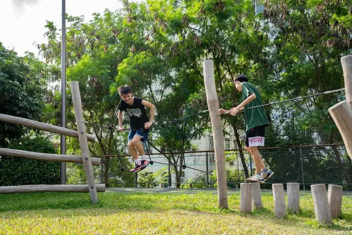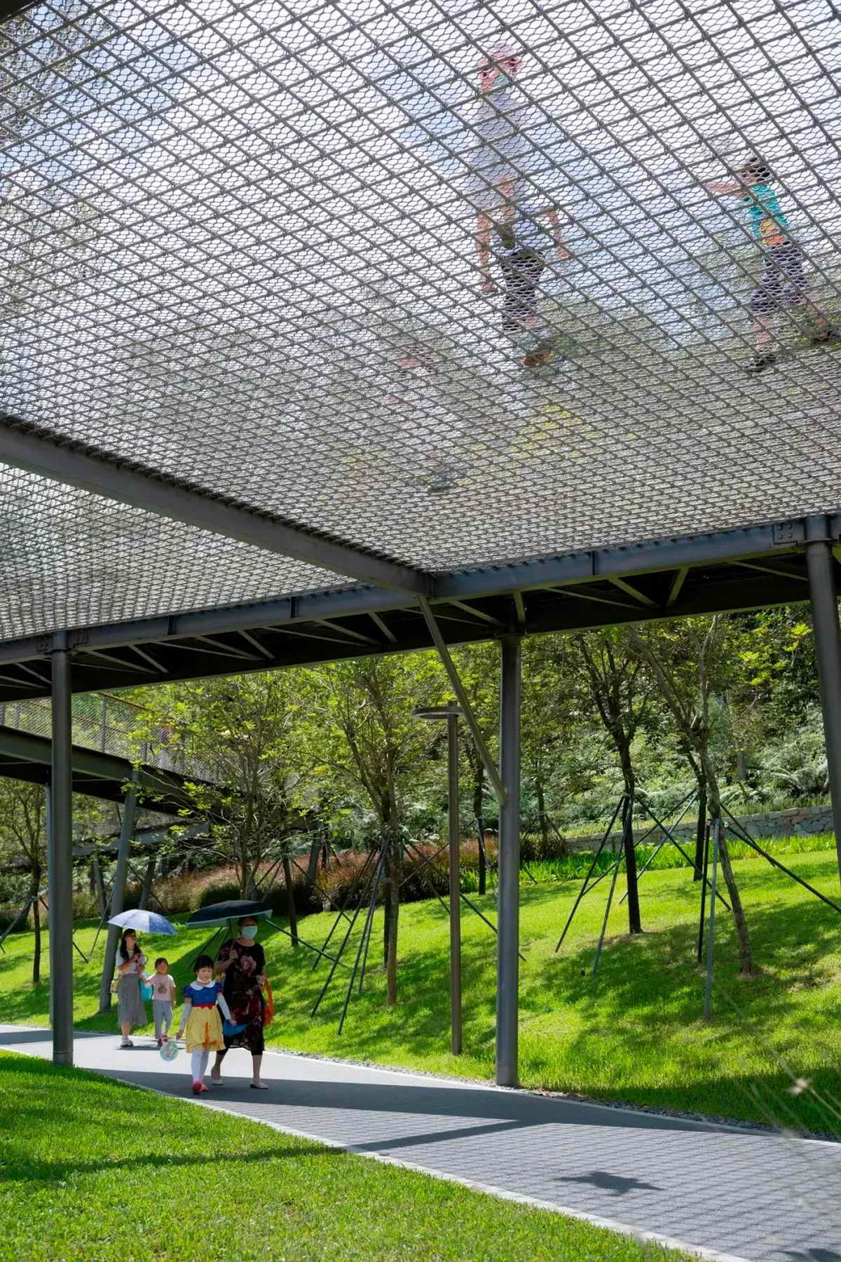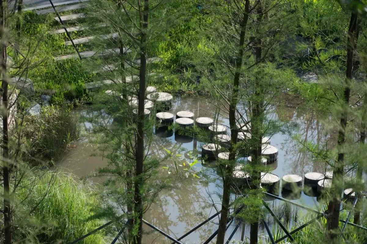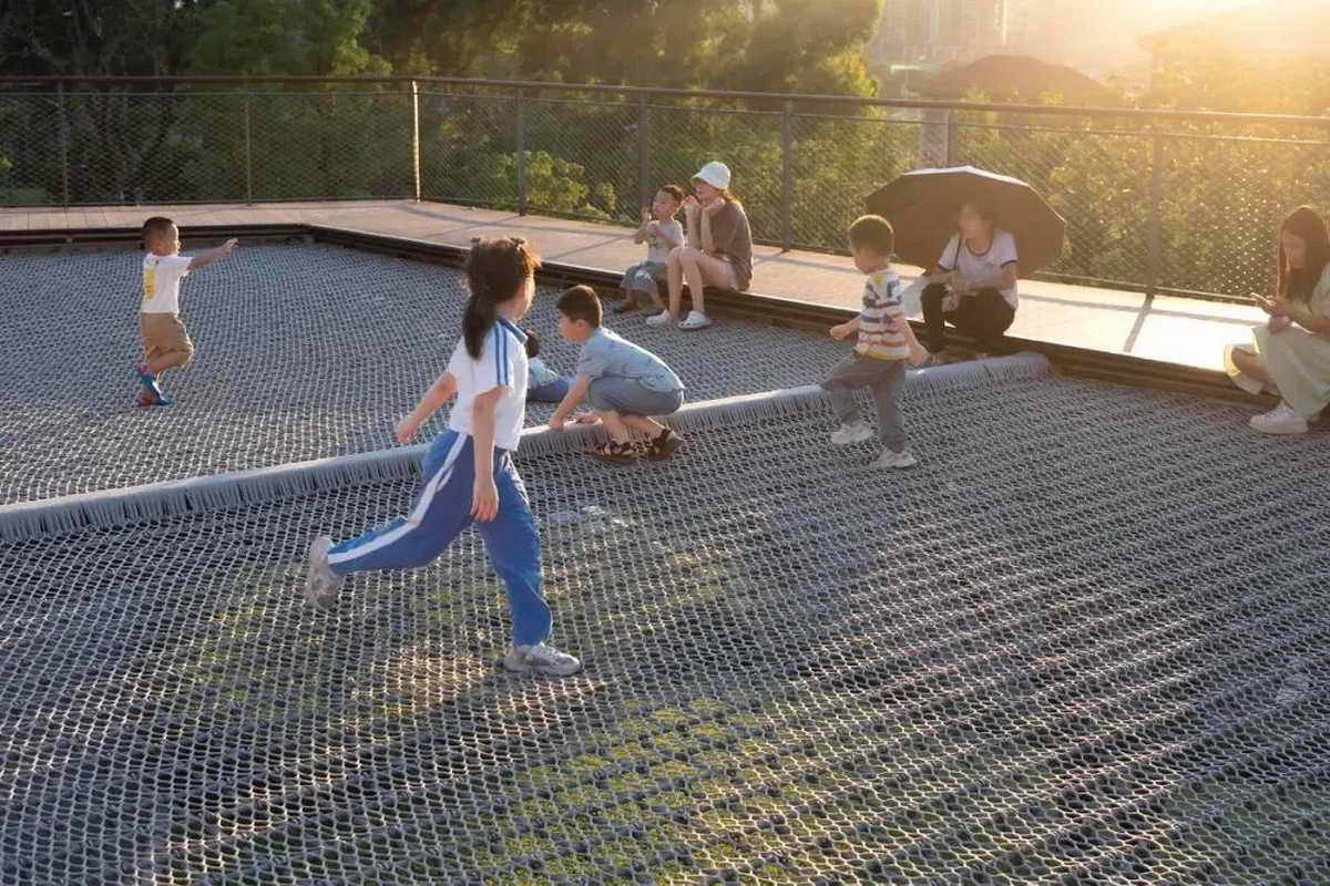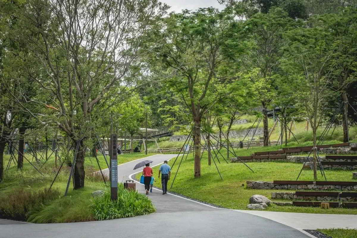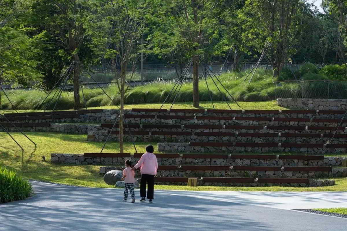 按照原生态、近自然、少迁树的原则,公园完全保留了建设范围内原有的荔枝林,并通过底层植被梳理、辅以平衡木等设施,营造成可供儿童游玩、休憩、攀爬的林下亲子游乐空间。