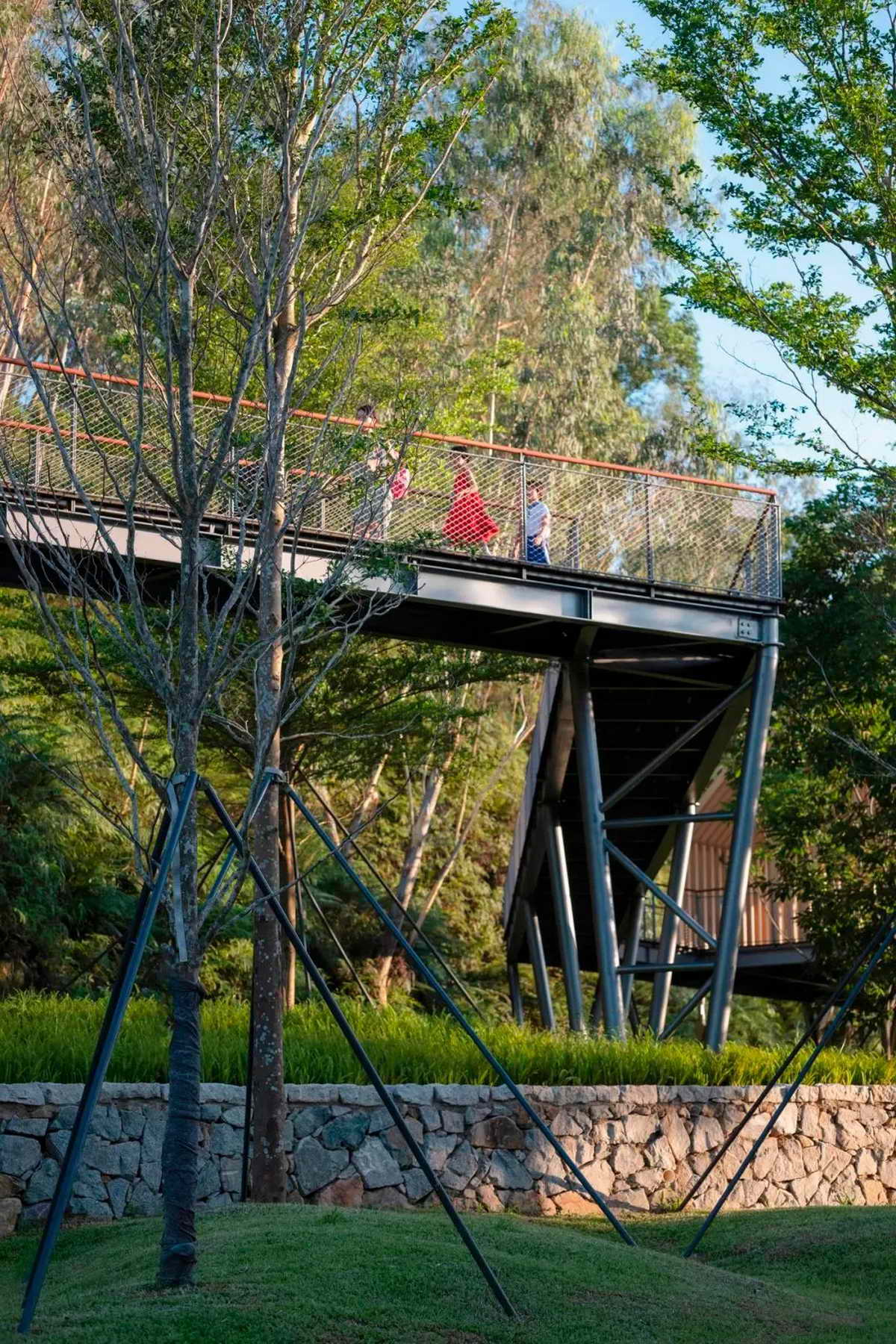 巧妙地将自然地形地貌与儿童游乐设施相融合,通过梯级平台与空中连廊弥补高差,利用高差设置了爬梯、滑索等游乐设施。