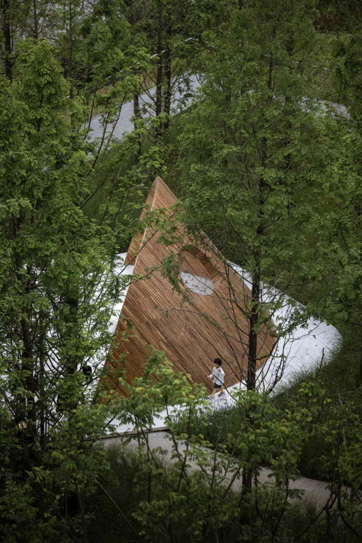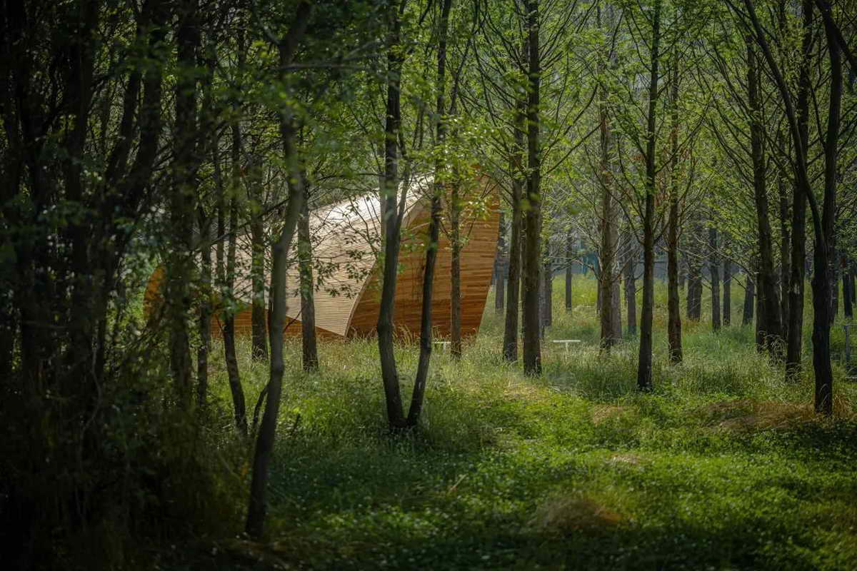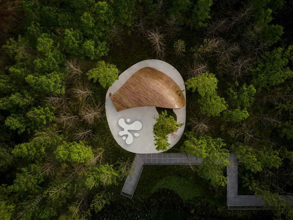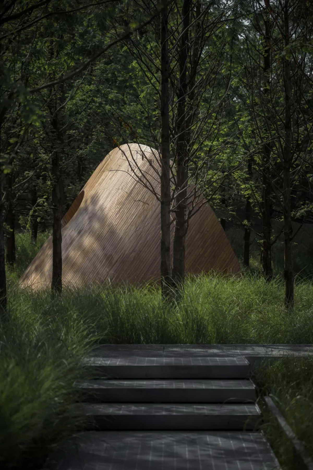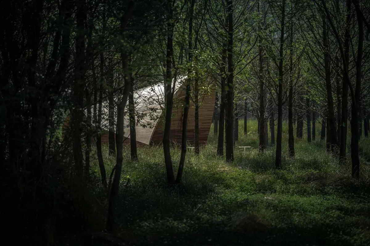 两组“荷叶”以自然的空间形态卧于湖畔,其开口面向最佳的风景视野。为了使安装过程不影响周边的自然环境,装置以钢结构为主框架,在工厂中预制生产后,分段运输至现场拼装。整体饰面用窄木条拼接而成,以柔和温暖的空间质感融入场地。