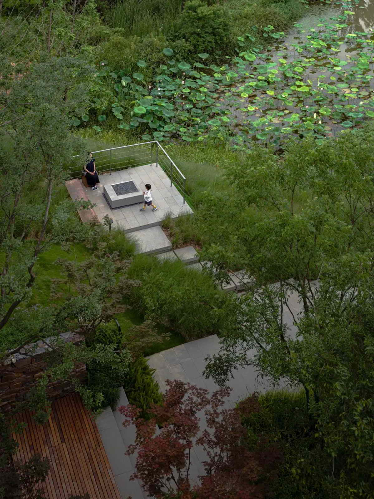 拾阶而下便来到不同标高上的画作平台,有的隐于林中,有的凌于水面,与画室一起,形成了供居民欣赏风景、户外采风的公共空间。