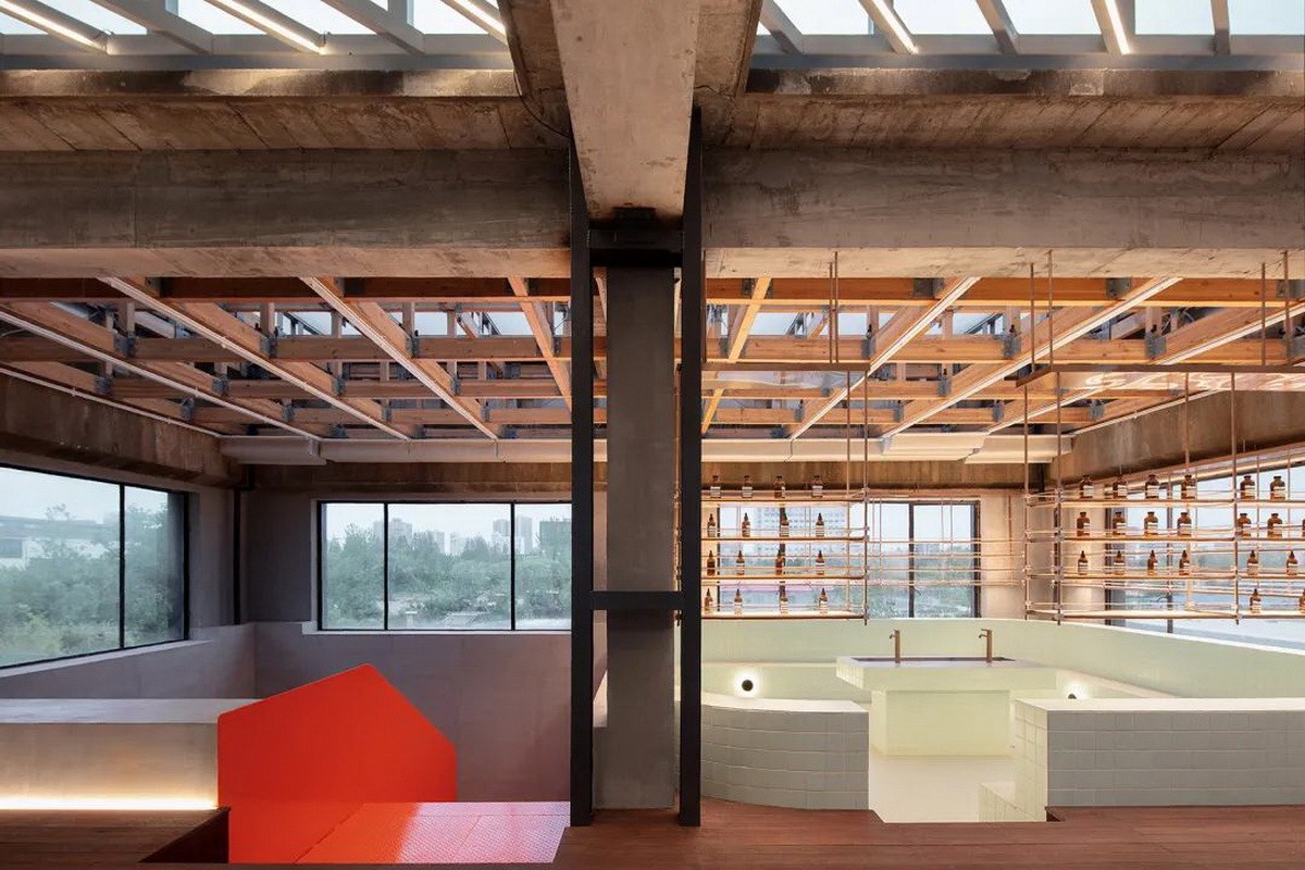 根据早期的相关城市规划,的相关城市规划,上海制皂厂的原有水池归入被拆除行列,建筑改造与景观设计极力保留了这些构筑物,通过增加水池之间管道和上人景观屋面重新确定了这些水池的再利用的方式。建筑改造之后呈现的空间骨骼有力,工业和科幻感对撞,路径设定完整并具电影场景感,是空间条件极具独特性和辨识度的工业遗存空间。