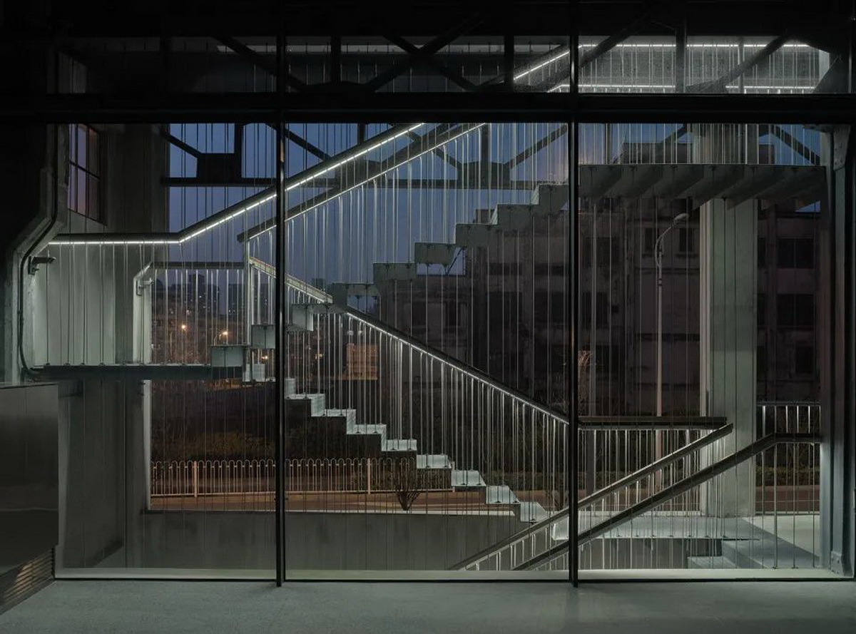 建筑西侧与南侧的界面采用“修旧如旧”的改造方式:在保留30年代原有仓库钢筋混凝土厚实墙体形制的同时,精心修复了极具历史特征的南侧门窗木框和西侧排风扇。