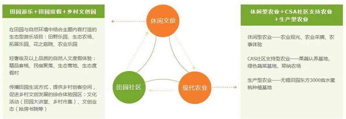 以生态自然型多样的旅游产品和度假产品组合;开展田园社区建设,服务原住民、新住民和游客,最终形成的是一个新的社区。