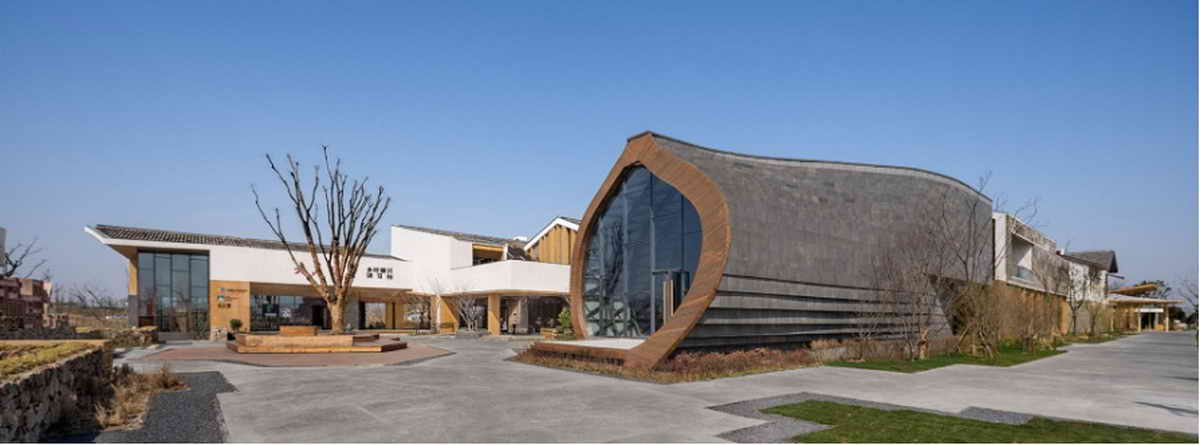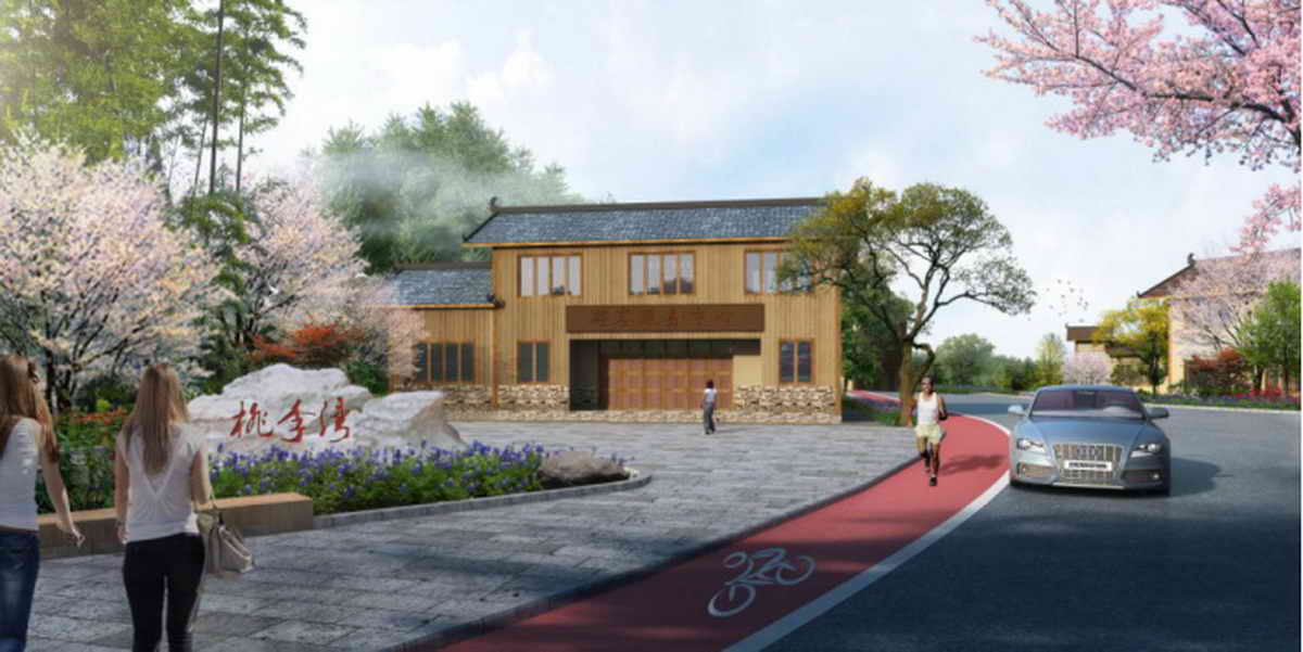 通过建筑整体视觉的白墙青瓦、竹木饰面营造出与周边桃林远山融合的村落感,