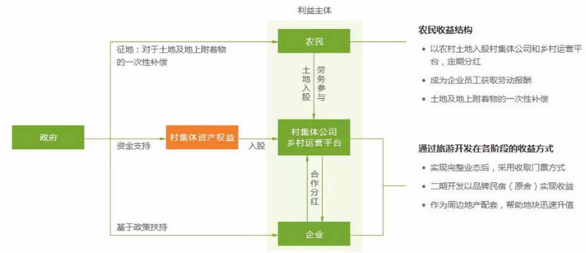 农民以农村土地入股村集体公司和乡村运营平台,定期分红,同时成为企业员工获取劳动报酬,另外也可获取土地及地上附着物的一次性补偿。