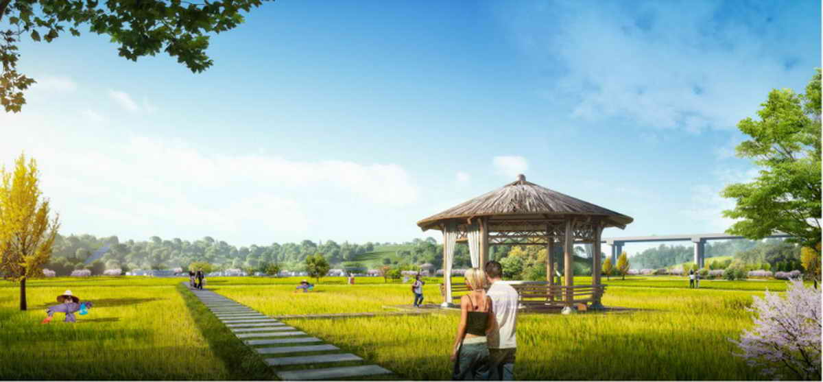 在村庄周边有大面积的种植农田,对现状田埂进行加固改造,田野中运用大地艺术图案以及景观休闲廊架的点缀,