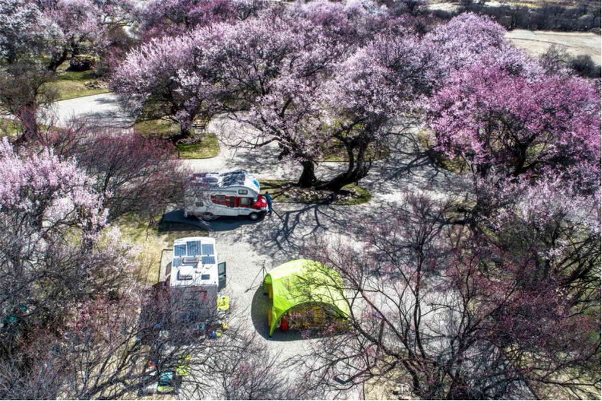 山泽居房车自驾营位于西藏林芝米林县城境内朗嘎附近,连接米林县城至林芝机场的桃花大道旁。项目基地在雅鲁藏布江扭转形成的一个驳岸上,岸对面的沙洲生长着成片的柳树林,四周是延绵不断的雪山群。