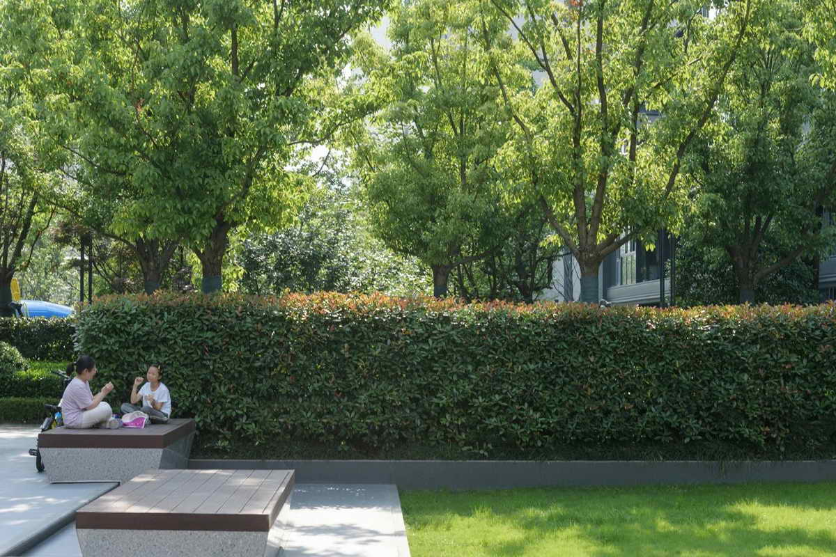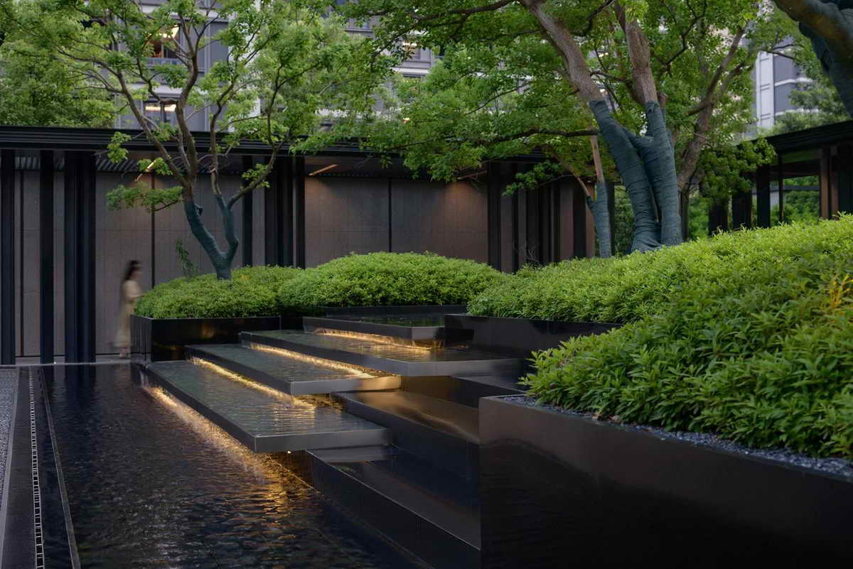 初夏的气息在空气中弥, 细腻的阳光透过乌桕洒落到这一方水院之中,光影斑驳。抬高的叠水一层层如山涧溪流般汩汩而下,树形优美树冠宽大而蓬松的乌桕撑起了整个小院的绿意盎然。我们希望这春夏观景遮荫、秋观叶、冬观形的乌桕,能在不同季节带给人们不同的惊喜。