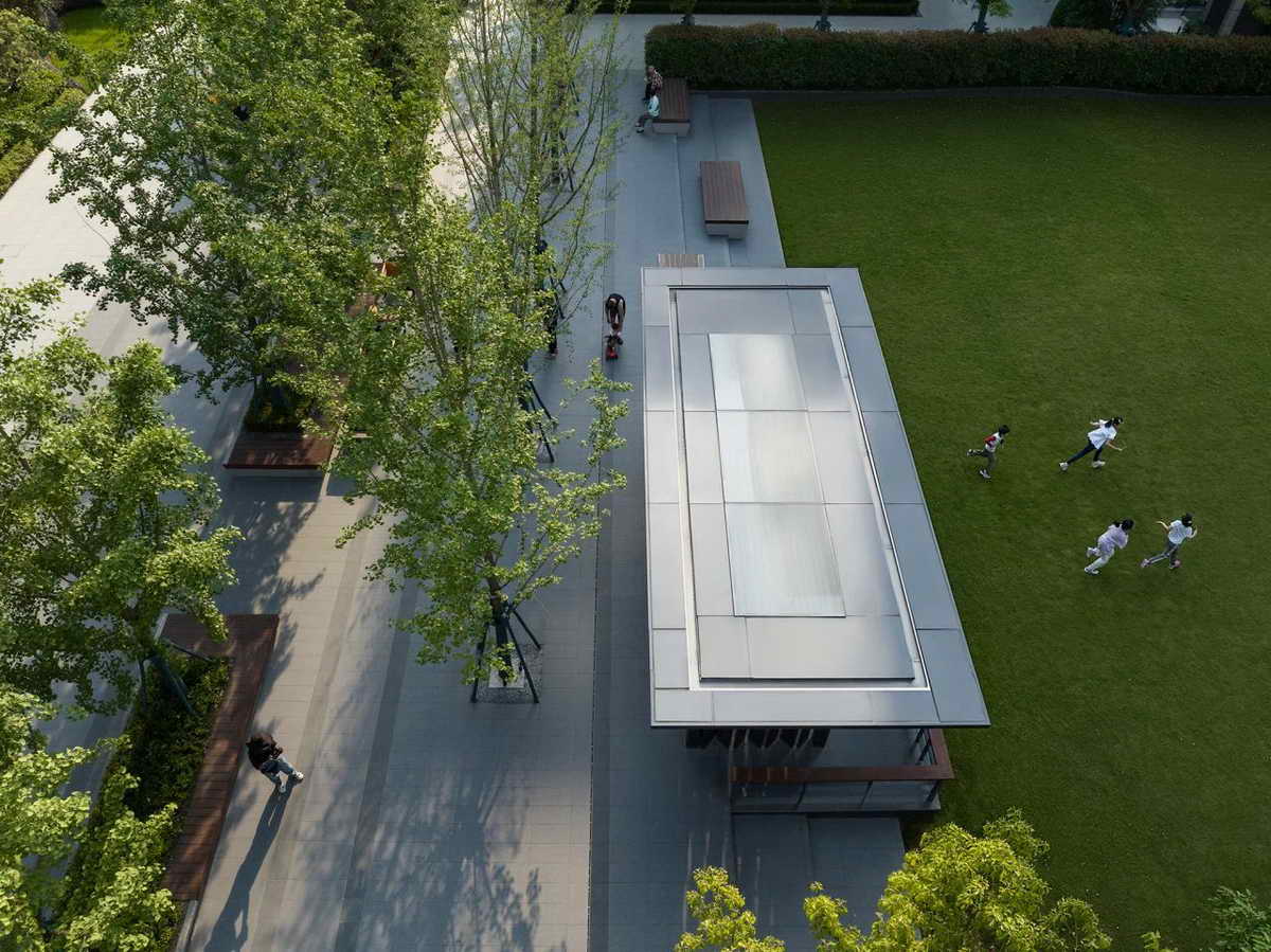 廊架如同漂浮的船只,为人们遮风避雨,为更多形式的活动提供了可能。顶檐角轻盈飘逸,隐藏在林中。在初夏烈日还不那么灼热的时候,这种微反光的状态,会显得格外的温润。