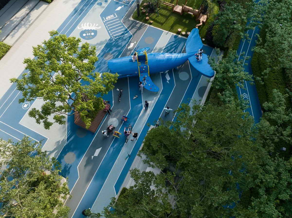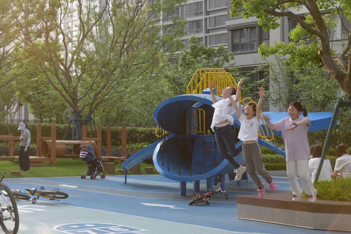 四米宽的归家道,结合扑救面形成林下广场区域,我们巧妙的利用铺装形成水岸与水的关系,中间起伏的大草坪,如浪涌形式形成中间水潭。“软硬兼施”,使孩子们穿梭奔跑变得更加趣味,也让人们的活动变得更加多元化。