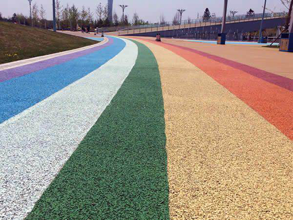 以树脂为胶结材,靠树脂聚合物硬化将骨料粘结成多孔混凝土。多用于广场,鉴于树脂为透明,骨料多用彩色石子,显露石子本色,增加景观效果。缺陷:树脂透水混个凝土硬化后较脆,耐冲击性能差,易老化。