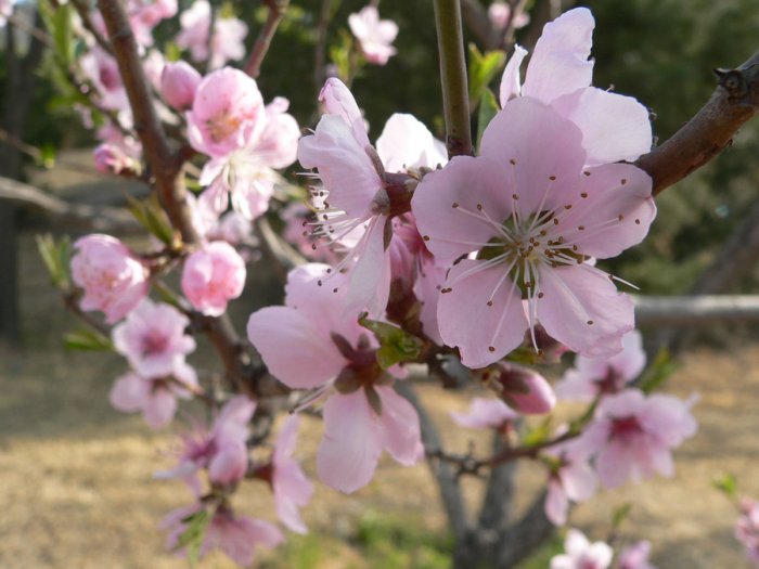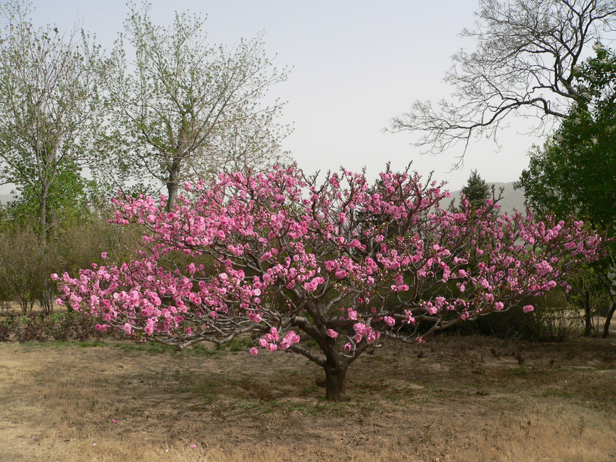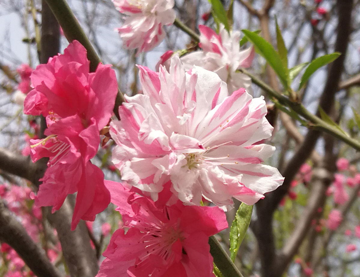垂枝桃“Pendula” 枝条下垂;花多近于重瓣,并有白、粉红、红、粉白二色等花色品种