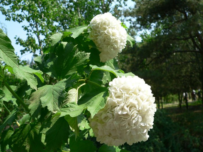 高可达4米;冬芽卵圆形,有柄,无毛,叶片轮廓圆卵形至广卵形或倒卵形,通常3裂,掌状,无毛,裂片顶端渐尖,边缘具不整齐粗牙齿,椭圆形至矩圆状披针形而不分裂,边缘疏生波状牙齿,叶柄粗壮,无毛,复伞形式聚伞花序,周围有大型的不孕花,总花梗粗壮,无毛,花生于第二至第三级辐射枝上,花梗极短;萼齿三角形,均无毛;花冠白色,辐状,花药黄白色,不孕花白色,果实红色,近圆形,5-6月开花,果熟期9-10月。