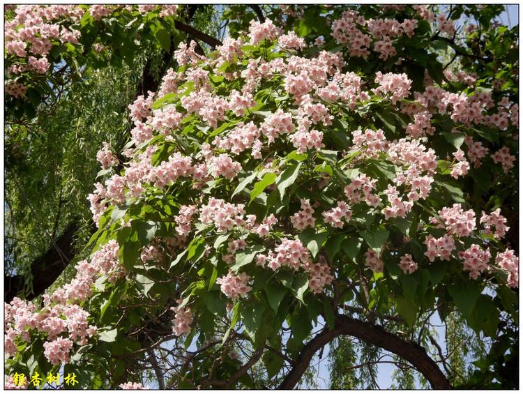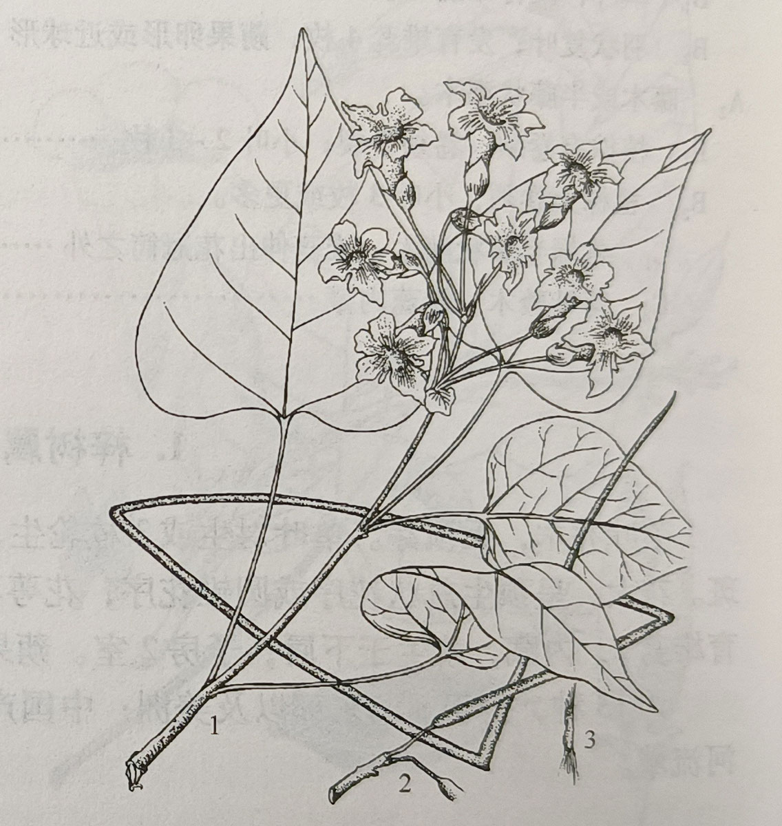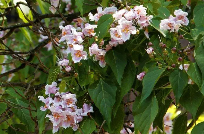 花冠白色或淡红色,内面具有2黄色条纹及暗紫色斑点,长3-3.5厘米。蒴果线形,长25-45厘米,宽约6毫米。种子狭长椭圆形,长约1厘米,宽约2厘米,两端生长毛。