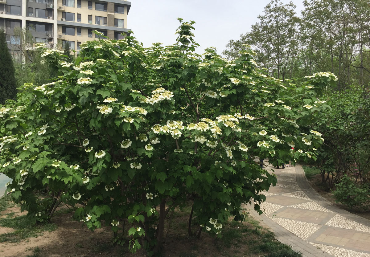 聚伞花序,具大型白色不育花;花妖常为紫色;花期5-6或7月