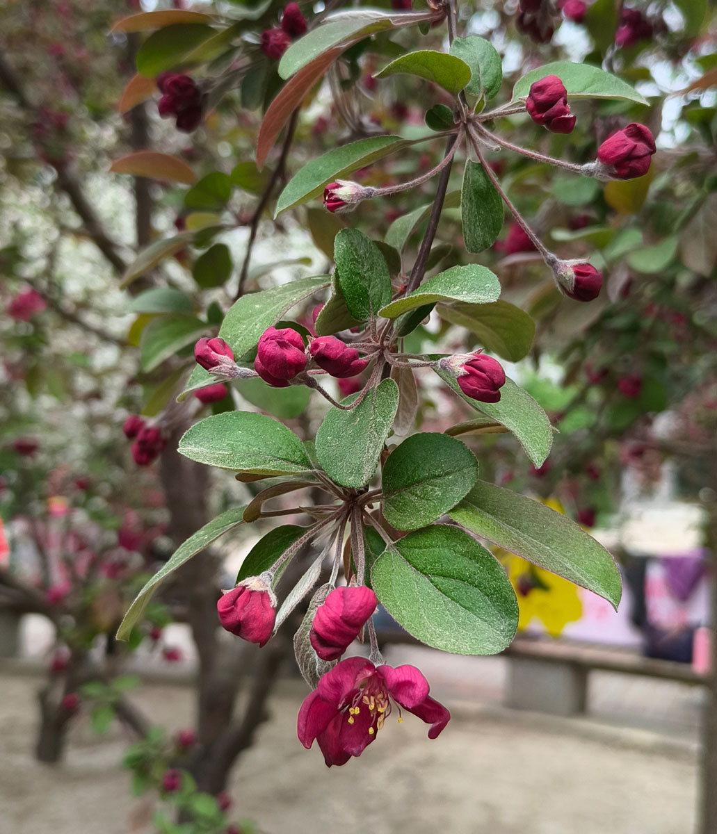 杯状小花,花蕾浓红,花色前期玫红,后期雪青粉,花芳香,布满枝条。华北四月中旬盛花,冷艳秀。