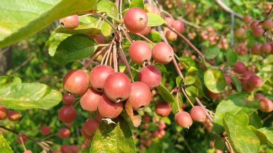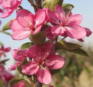 落叶高大乔木,株高可达8m,树型直立,树冠圆而紧凑,树干紫褐色。小枝紫红色,具光泽,疏被短柔毛。叶片卵圆形至椭圆形,先端钝尖,基部楔形,边缘具钝锯齿;新叶棕黄带绒毛,夏季叶色绿中带紫红,秋叶呈橘红色。花期4月上中旬,伞房聚散花序,花蕾深红色,皱缩,花杯状,深洋红色,花心部颜色渐淡,5-6朵聚生,单瓣,花瓣稍圆阔,花径3~5cm,花有大小年。果实橄榄形,果径1.3~2cm,果量大,6月浅酒红色,成熟后呈浓红色,冬季渐变为暗红色,经冬不落。