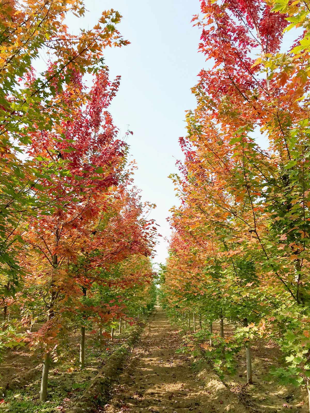 美国红枫经人工改良后具有较多变种,秋火焰是其中叶色表现较一致的树种,红叶性状稳定,秋叶变色的主色大红略偏深红,抗性强,病虫害少。