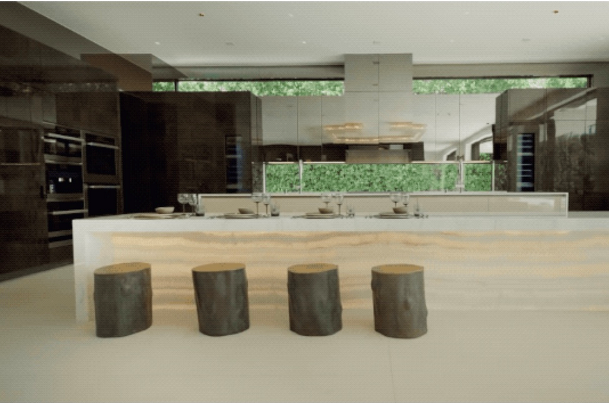 这栋别墅的总面积超过 1800㎡ ,外观基本上都是由大理石和玻璃打造,经典的黑白相间设计,简单又不失精致。餐桌采用的是会透光的云石作装饰,餐椅特地设计成了树墩的样子,光滑与粗糙形成强烈的对比,感叹大自然的神奇。