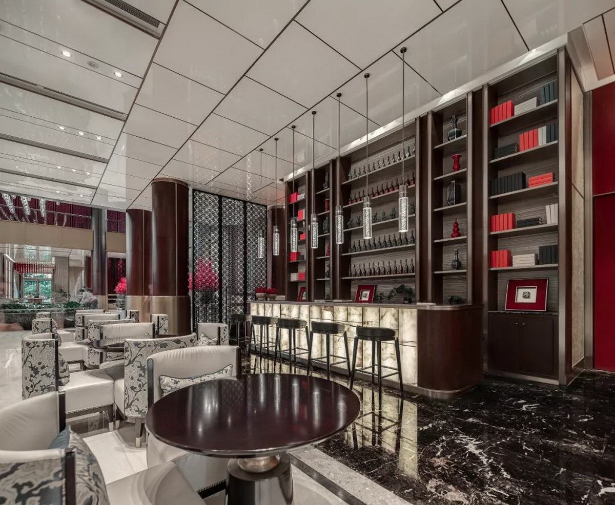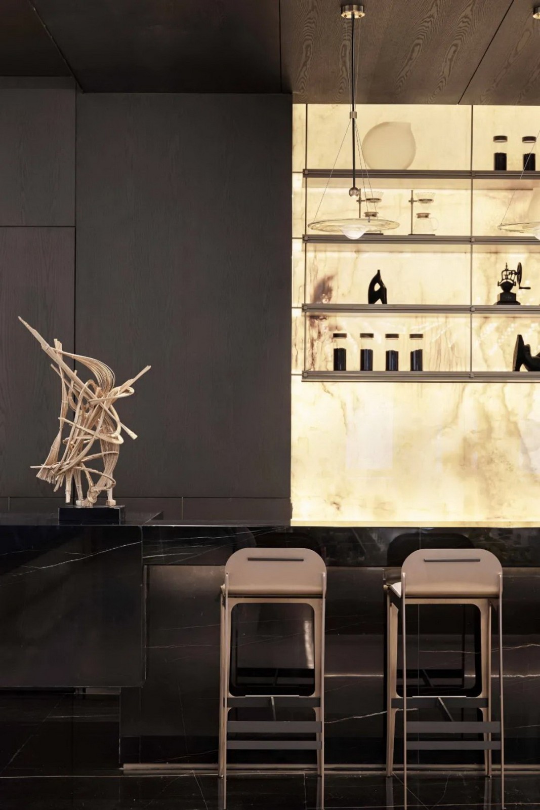 水吧区,压低了层高,显示出空间的层次感,也突出了水吧区域的功能。在透光云石与琥珀色灯光的烘托下令人感受卓越的品质感与舒适的心情。