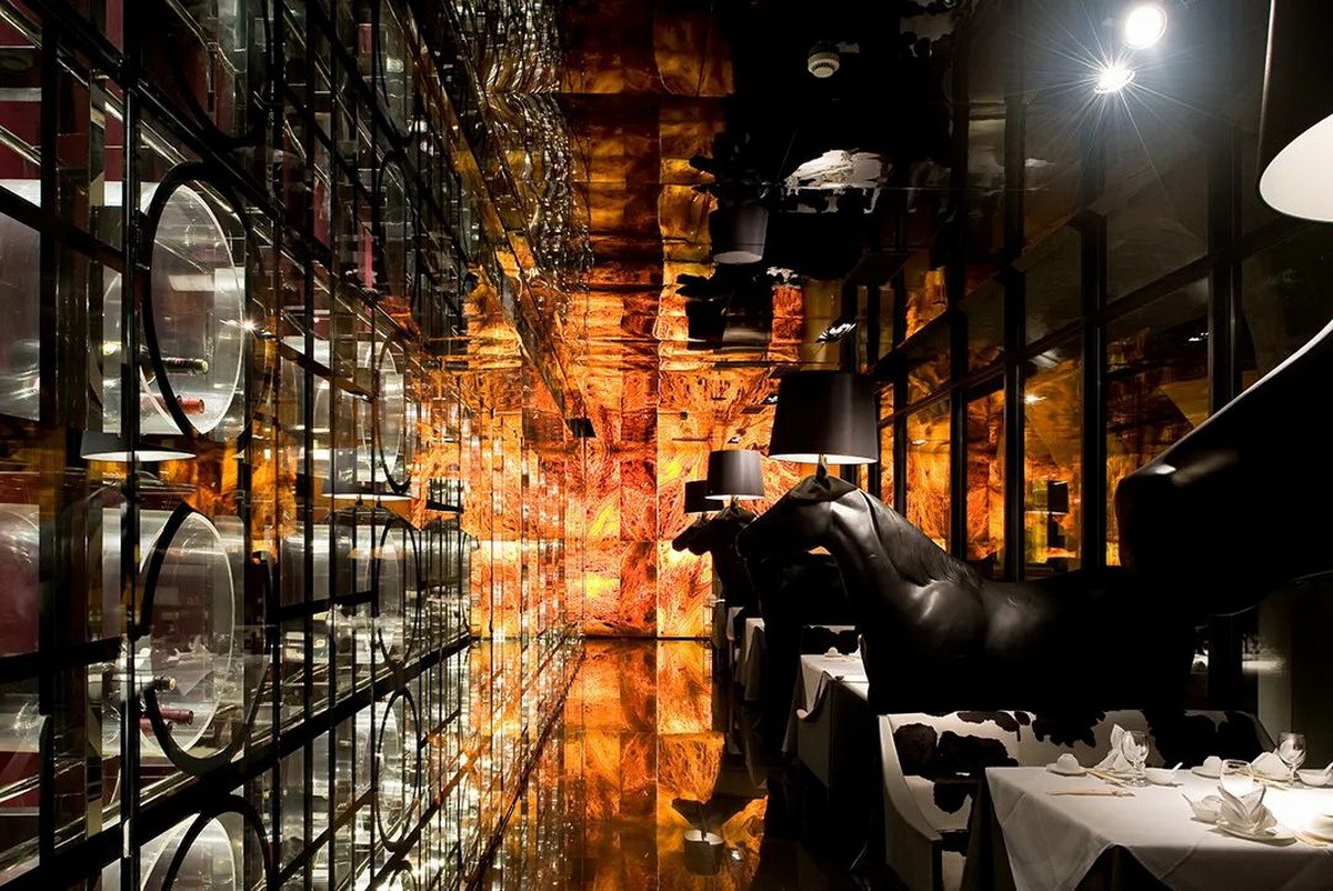 火作为设计灵感,以它的阳刚之气冲消和振奋这幢建筑原来的阴沉肃杀,并且营照出了中餐厅浓烈的氛围。餐厅的入口空间由透光云石砌成,云石上透着美丽的火焰纹路,仿佛时空隧道般地带领人们进入餐厅,强化了入口的仪式感和戏剧性。