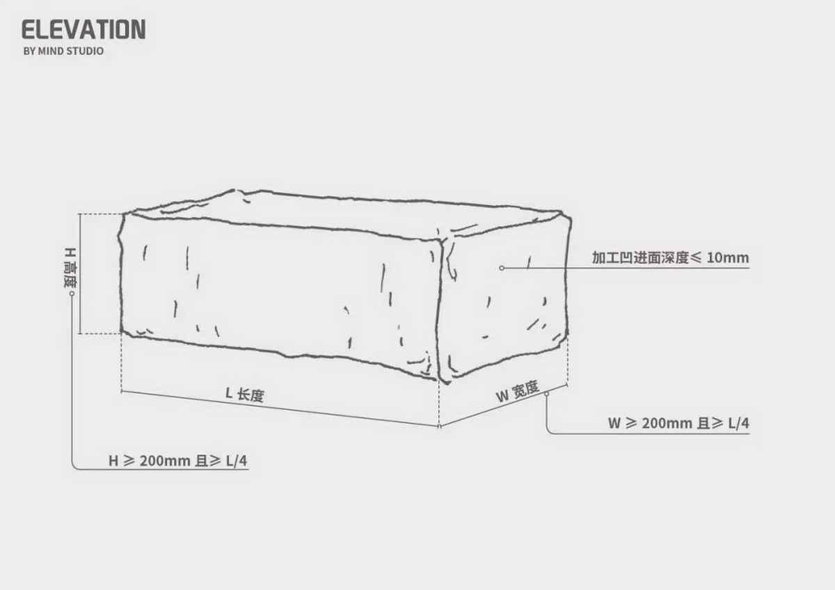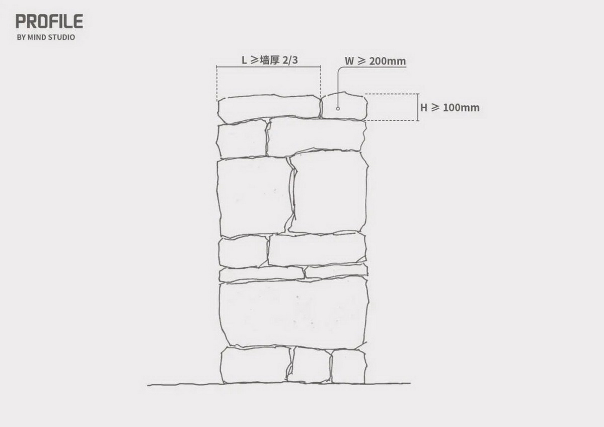 ④毛料石:外形大致方正,一般不加工或仅稍加修整,高度不应小于200mm,叠砌面凹入深度不应大于25mm。