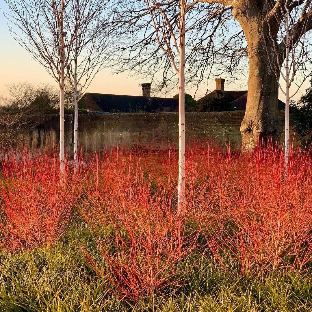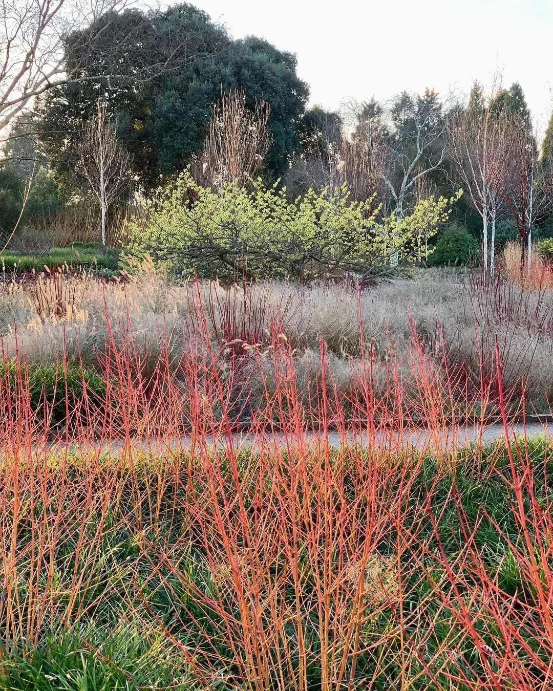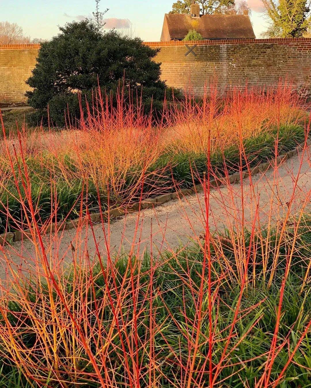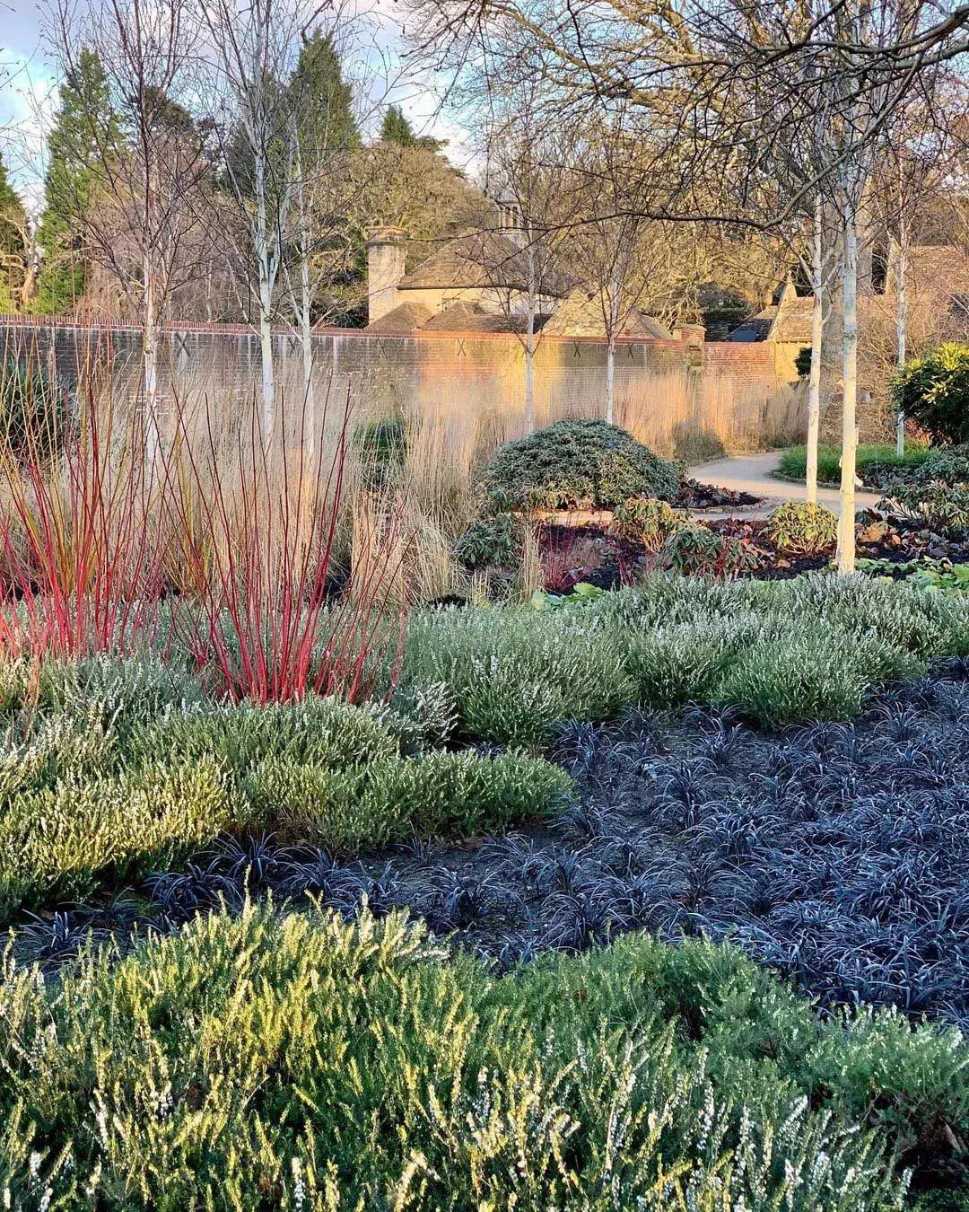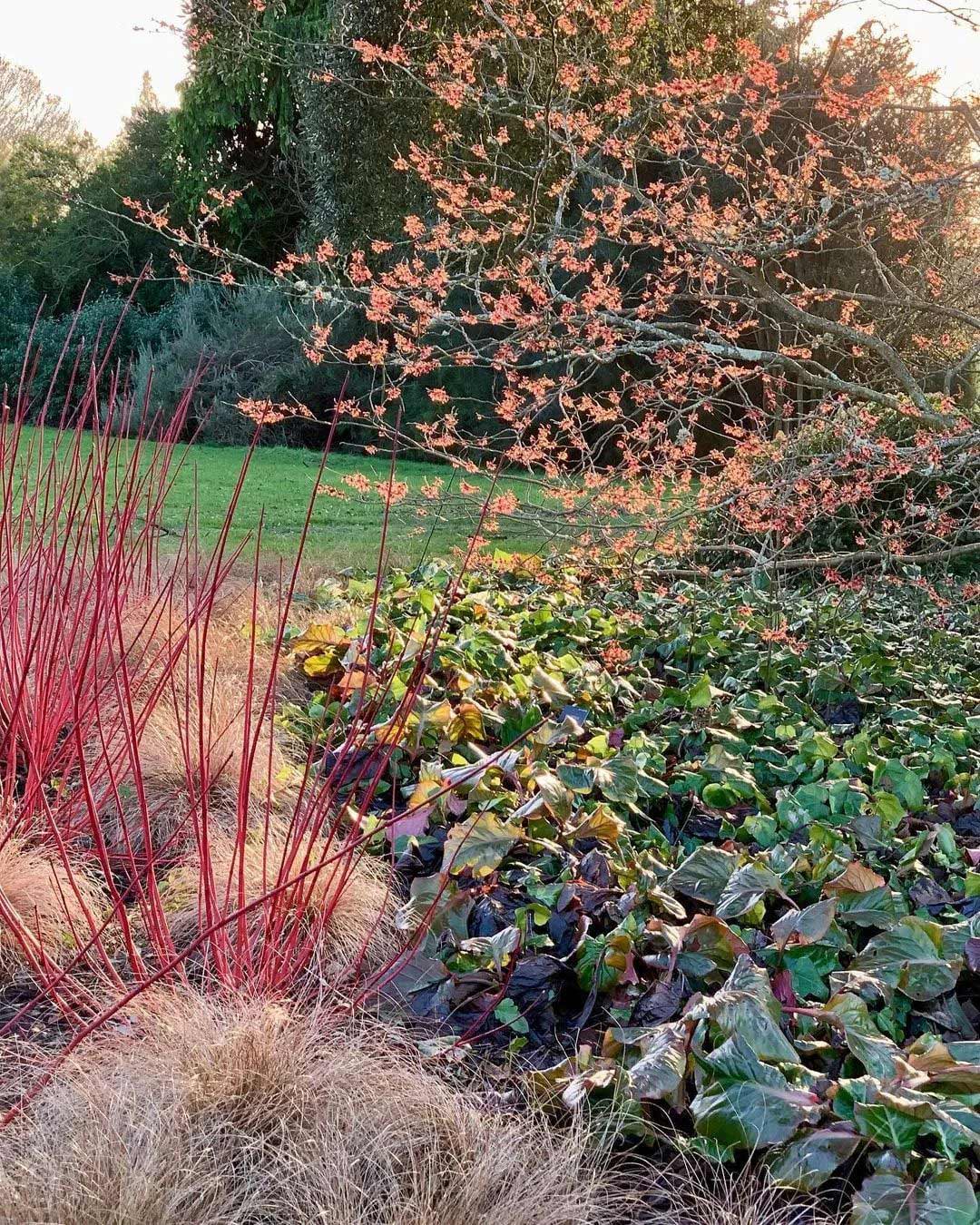 在一年中最冷的时候,需要一些色彩植物来吸引眼球,成为振奋精神的力量。冬天这里没有蓝色,只有红色、橙色、紫色、金色和暗红色。山茱萸的茎,金缕梅的花和岩壁菜的叶子,都为这个场景贡献了力量——那些温暖、明亮的色彩在冬季淡淡阳光的照射下更加强烈。 ![]()