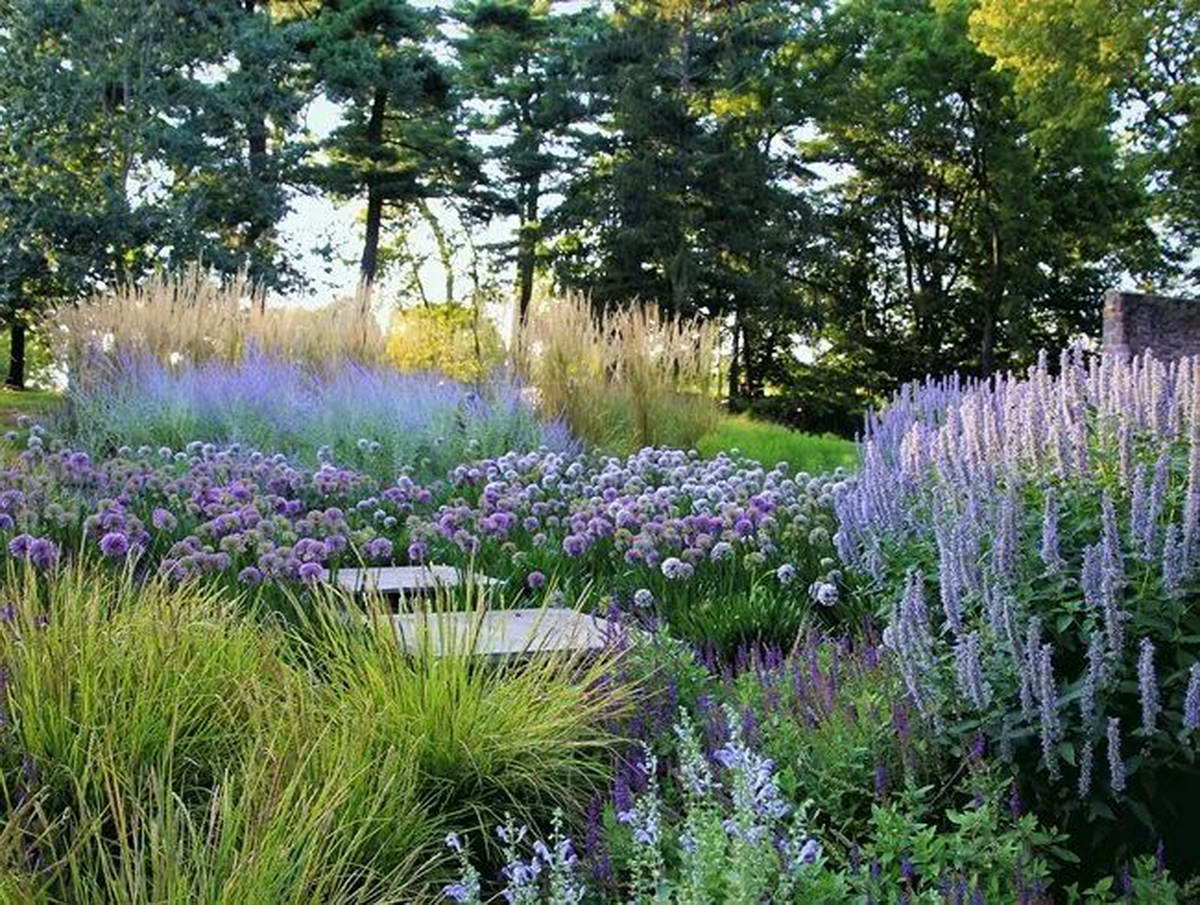 - 通过利用植物色彩建立景观连续性和流动性。在这个项目中,有蓝色和紫色花朵的多年生植物被用作各种花圃和边界的关键统一元素。