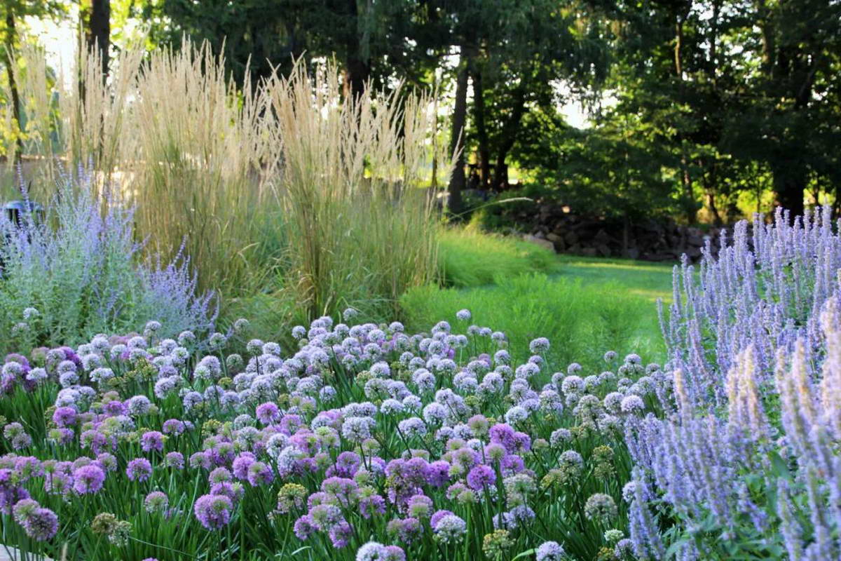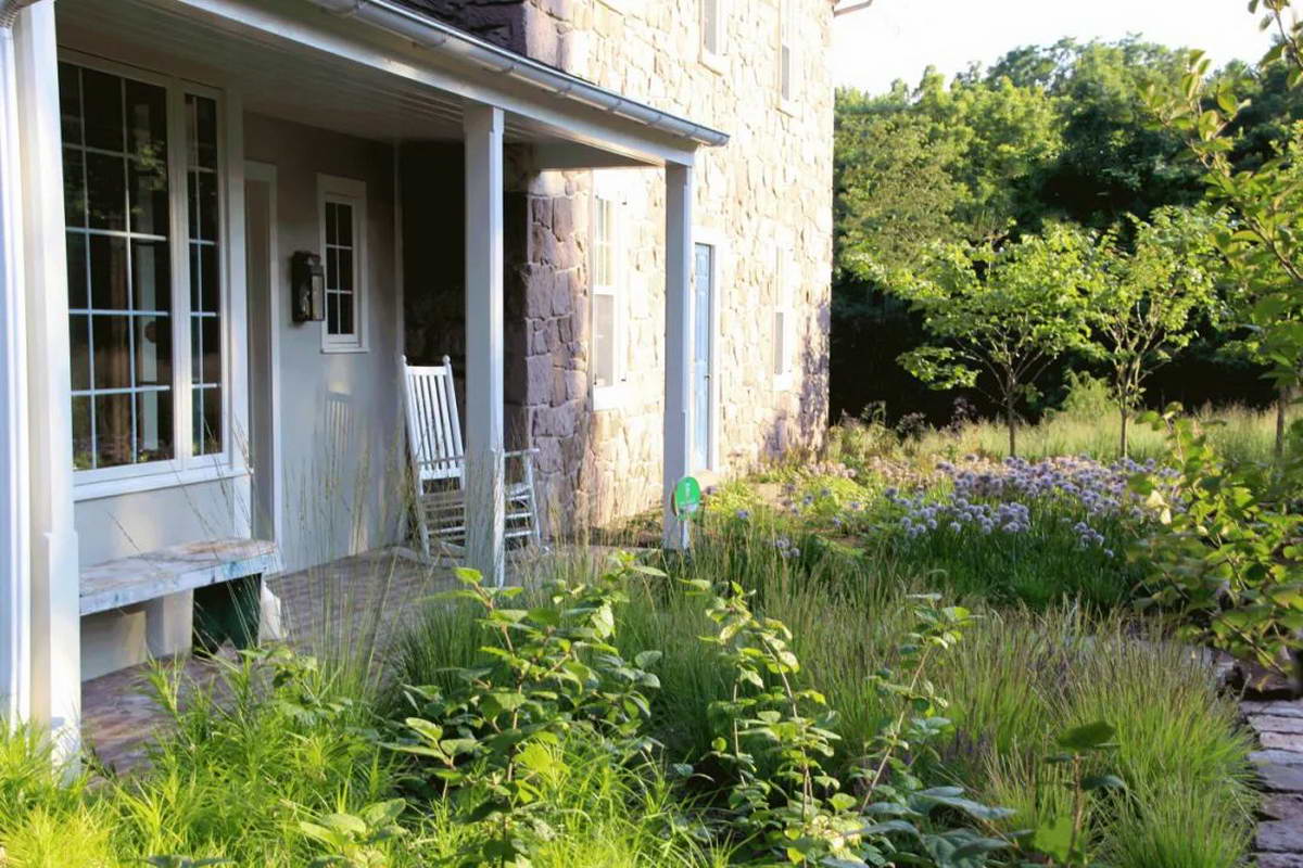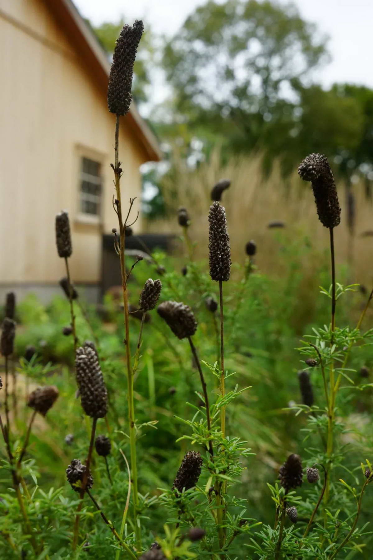 车库边花园使用的植物包括苔草, 尖拂子茅, 柳枝稷,日本银莲花, 紫菀, 牛膝草, 美国薄荷, 松香草,蛇鞭菊。
