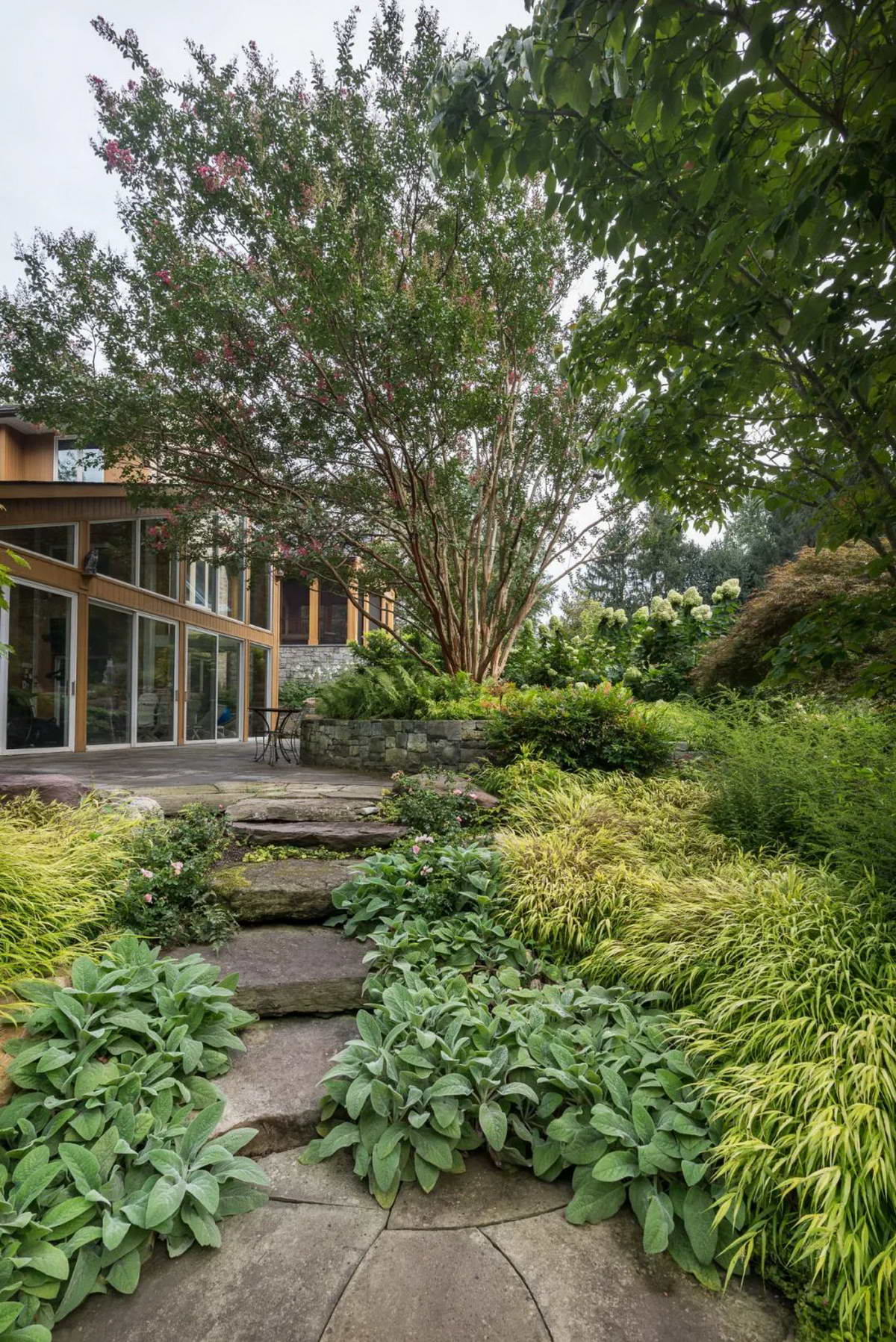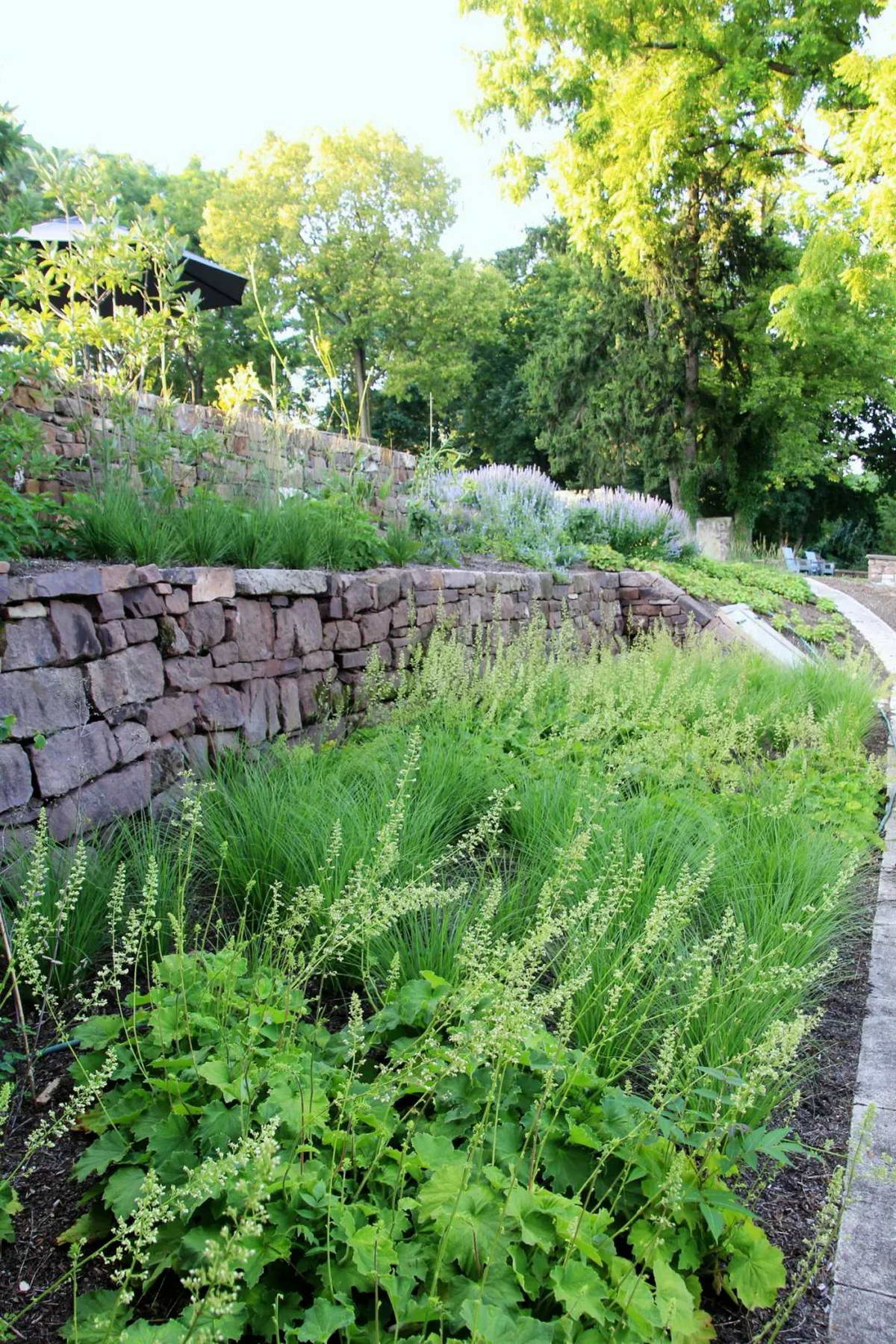 梯田式挡土墙花园使用的植物包括 弗吉尼亚木兰,“红运”夏腊梅, 牛膝草, 日本银莲花, 天竺葵, 长柔毛矾根, 黄芩,松香草。